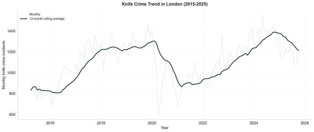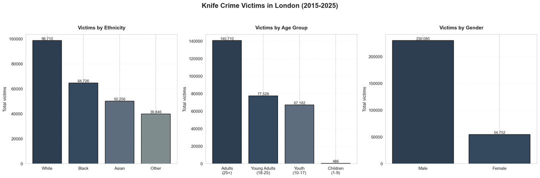 So according to that first image, middle chart… if we add up the totals of the bars, 140k, 60k and 80k, it means there have been 280k knife crime victims in London in a decade.