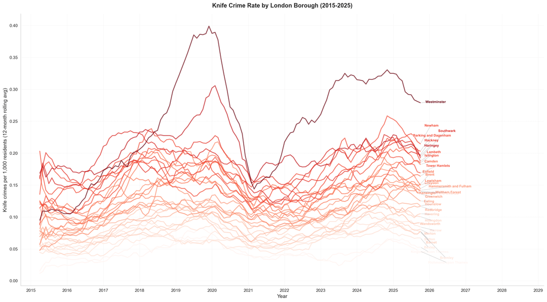 Used Python / Matplotlib for plotting, sources are london met police data from [https://data.london.gov.uk/dataset/mps-monthly-crime-dashboard-data-e5n6w](https://data.london.gov.uk/dataset/mps-monthly-crime-dashboard-data-e5n6w) and ONS population to get per 1000 values [https://data.london.gov.uk/dataset/office-for-national-statistics-ons-population-estimates-borough–vd615/](https://data.london.gov.uk/dataset/office-for-national-statistics-ons-population-estimates-borough–vd615/)