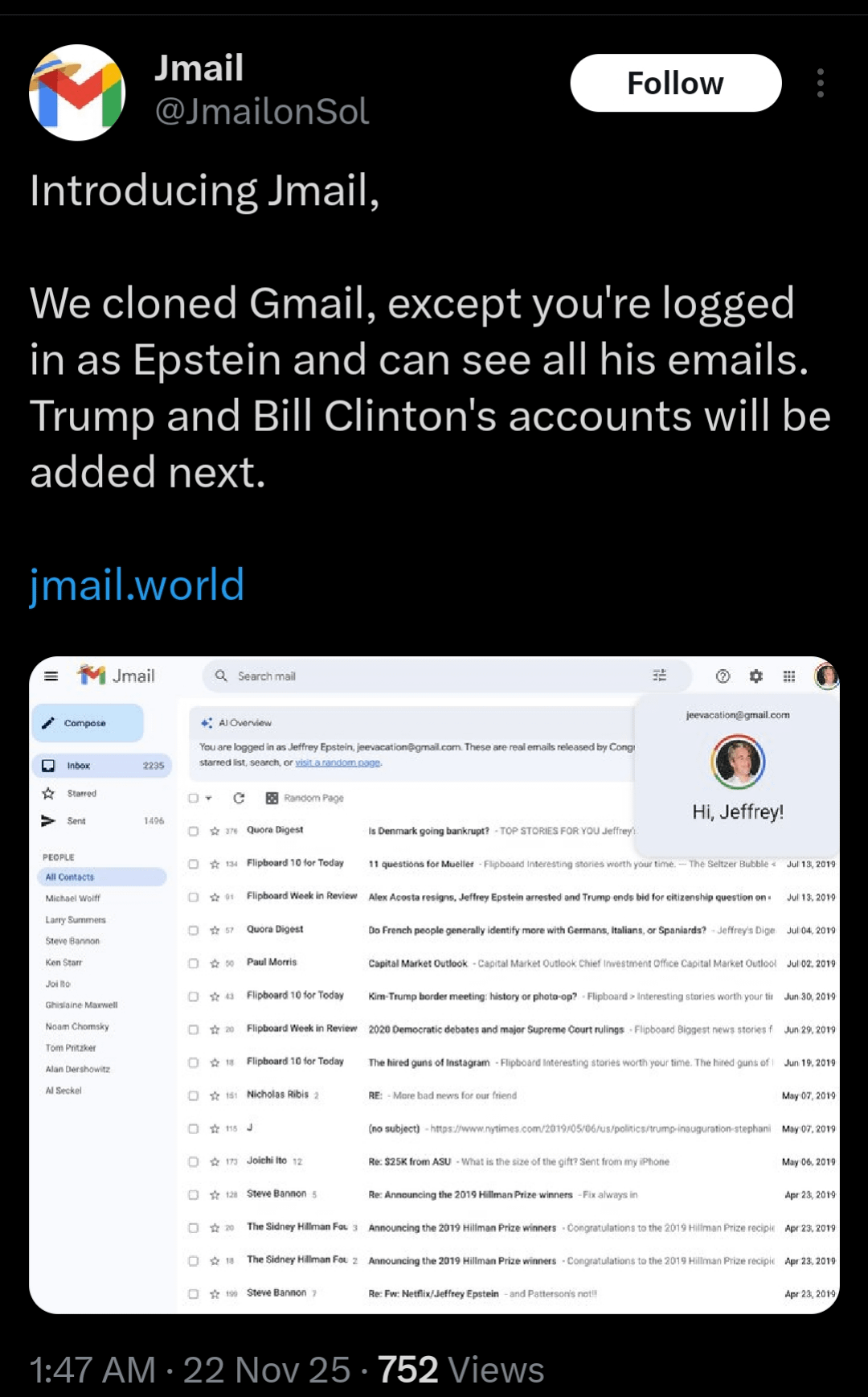 avid-shtf on November 23, 2025 2:40 am They took the emails that were publicly released then put them into a clone of Gmail’s interface. This isn’t anything that isn’t already publicly accessible. They didn’t hack Gmail. If they do it for anyone else it will be the same. Publicly accessible, previously released emails. Neat idea but maybe misleading to some people.