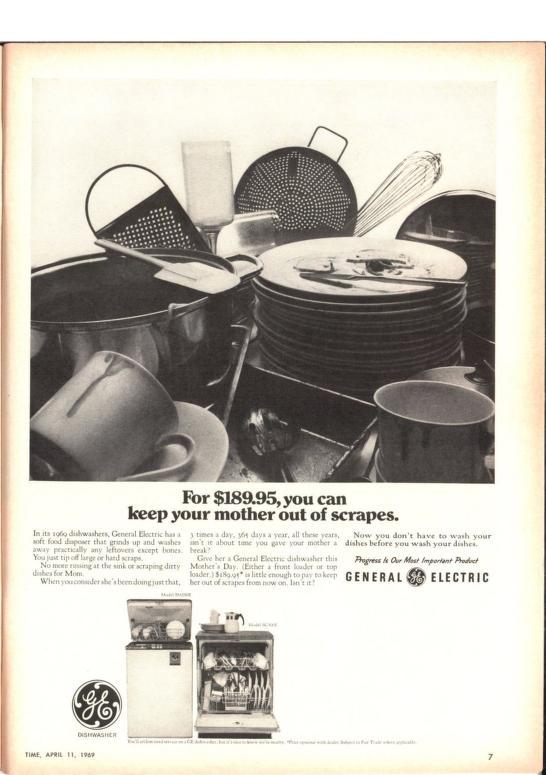 “For $189.95, you could keep your mother out of scrapes.” General Electric dishwasher ad, April 11, 1969 — when saving moms from dirty dishes was cutting-edge technology.