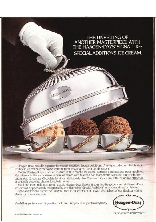 Häagen-Dazs ad introducing their “Special Additions” flavors, including Mocha Double Nut and Chocolate Chocolate Mint. From Time Magazine, July 13, 1987.