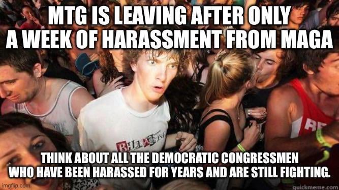 3. To give her some (perhaps undeserved) benefit of the doubt, her entire identity and campaign was wrapped around MAGA. Internally, she’s probably confused, conflicted given she no longer believes in the platform that drove her into office, and isolated with no real allies in Congress. Like, why stay in office if you no longer believe in the reason you’re there?
