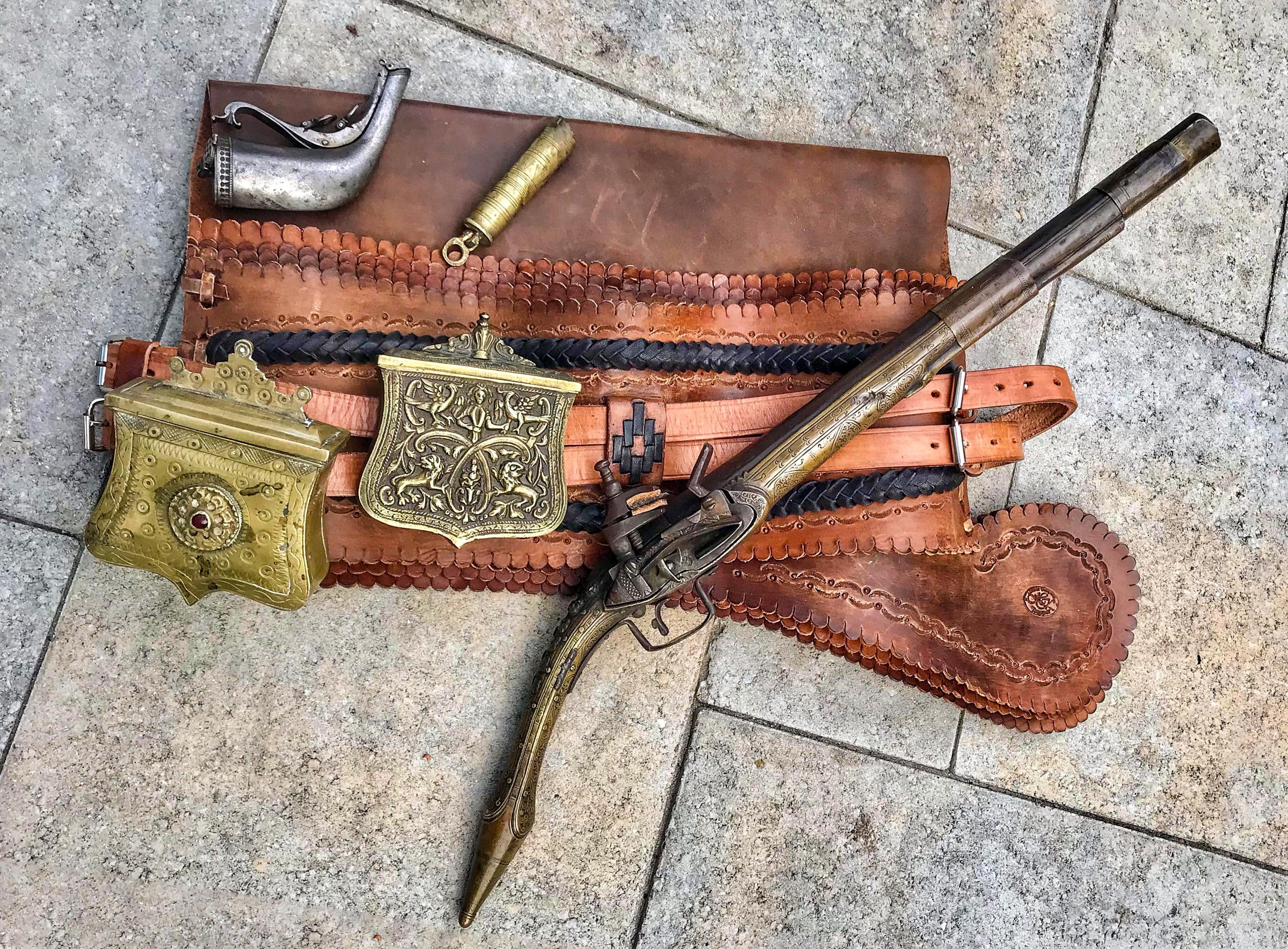 Pictured with a Silahlik (weapons belt) original powder measure, priming flask, and two Palaskas (cartridge boxes made from brass). This was a very common loadout in the region, but usually with 2 pistols and a Yataghan (short sword).”