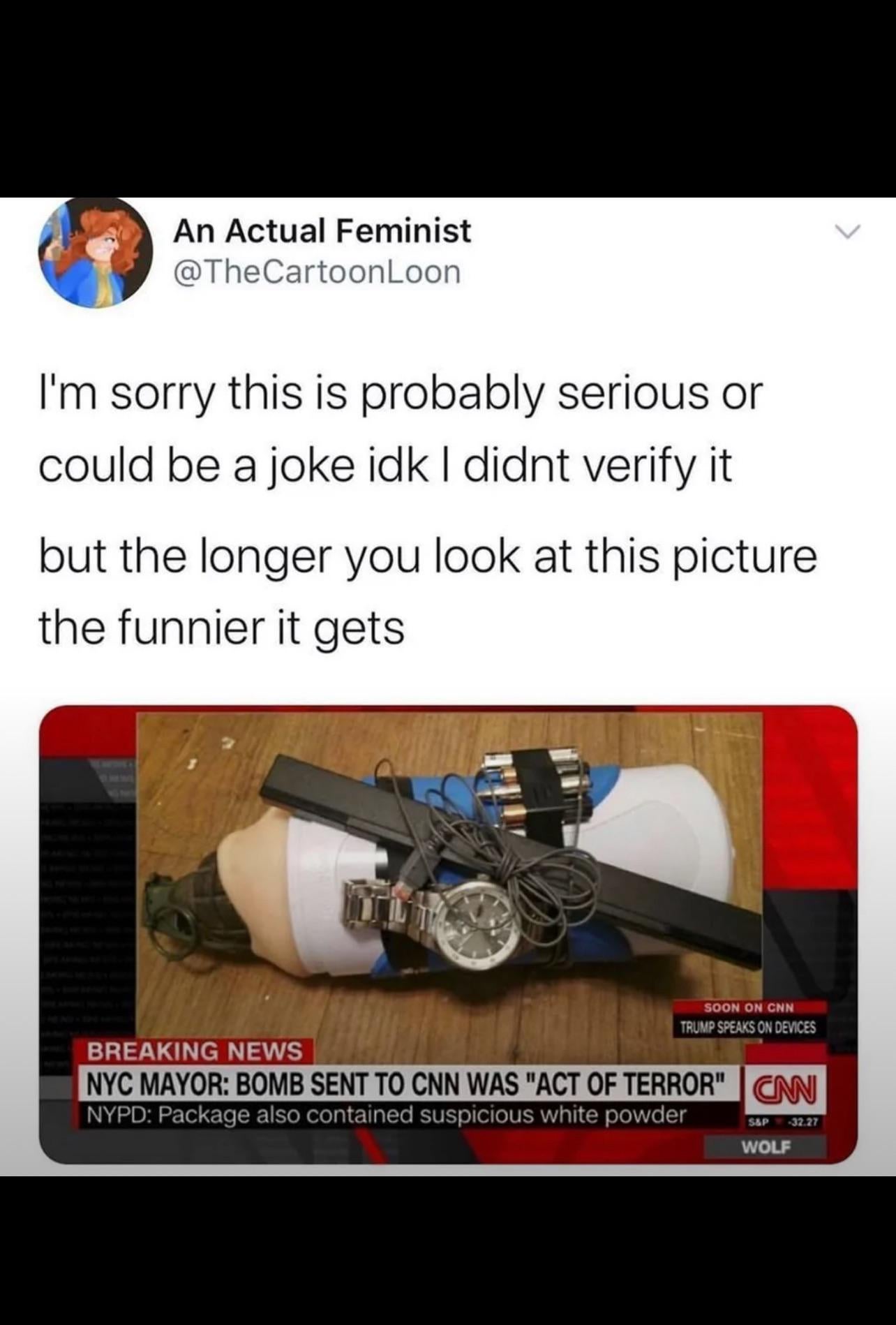 Fleshlight (mouth) with a grenade stuck in it, 3 batteries and 1 bullet (is that for shrapnel? lol), which are not wired up to anything. Mechanical wristwatch that needs to be connected via some kind of port…. lol
