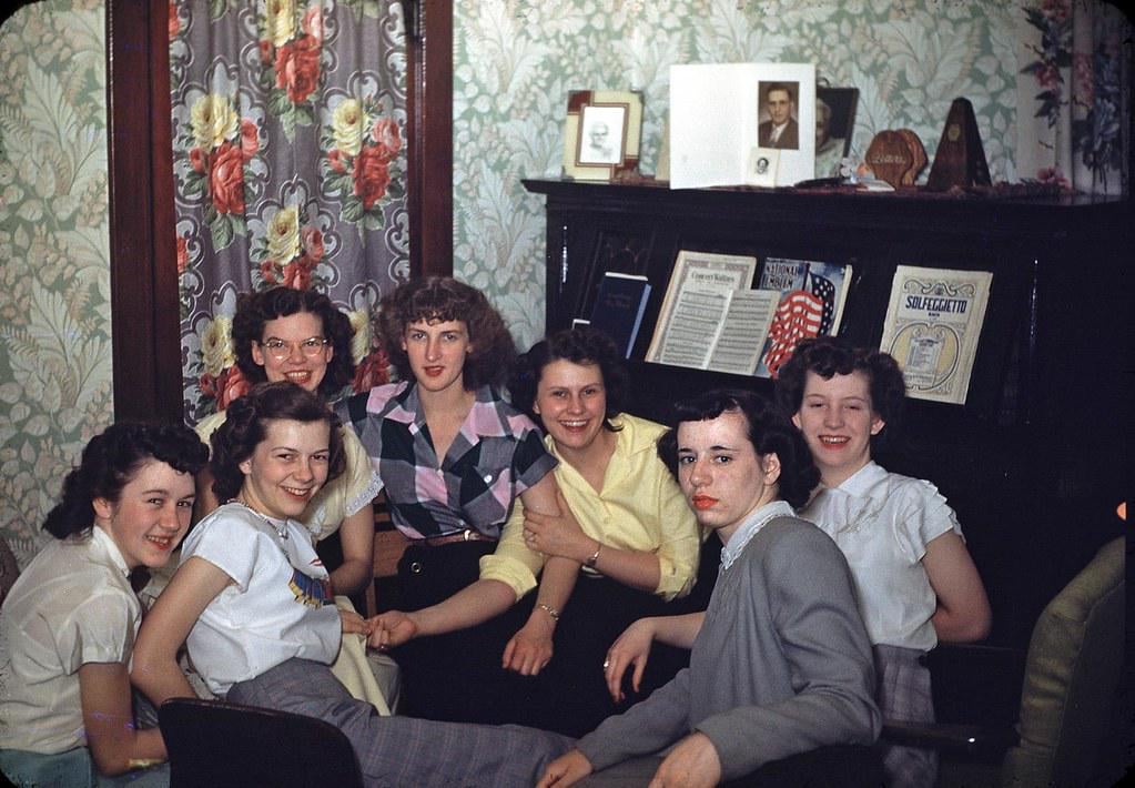 Friends enjoy some time thogether in the piano, 1950s. kodachrome shot