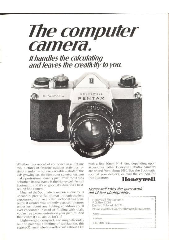 “The computer camera.” Honeywell Pentax Spotmatic ad from 1969—promising perfectly exposed photos and leaving the “creativity to you.” by AxlCobainVedder