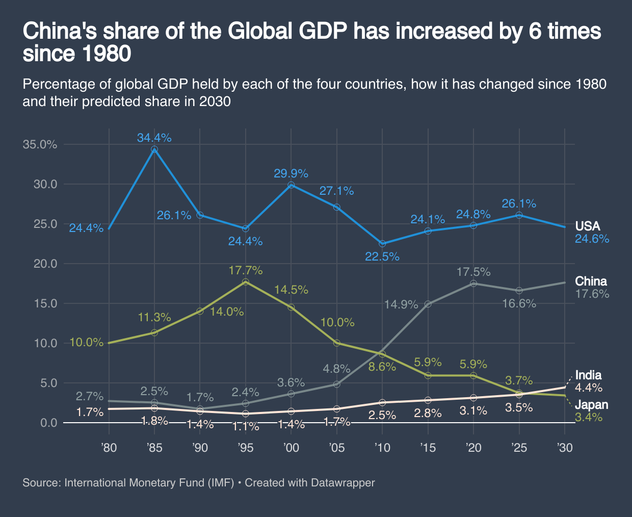 In general, it’s not so much that Japan’s economy is shrinking, but more so that the US and China are growing at explosive rates, relatively speaking. (Japan’s economy is 4x the size it was in 1980)