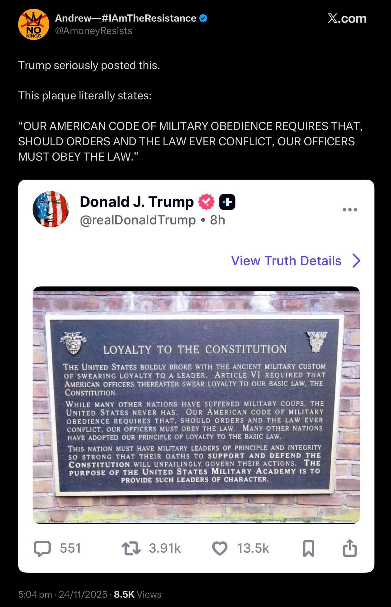He just likes the “loyalty” part of that whole thing. But considering he is a narc, he probably thinks he IS the constitution. Smh