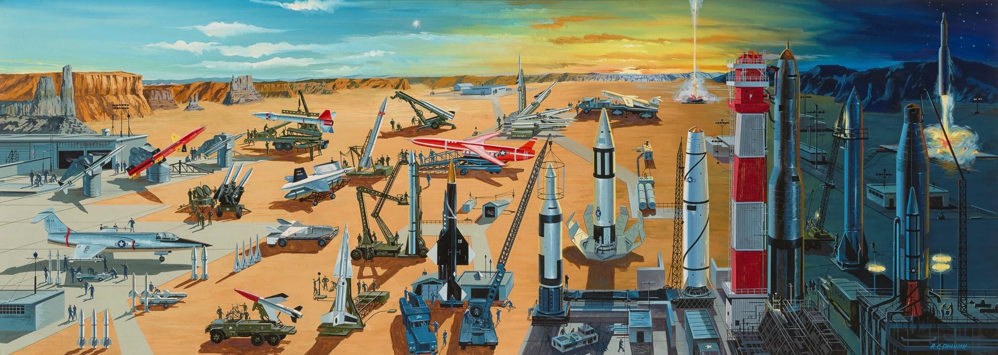 “Rocket Fleet In Desert Landscape”, R.C. Swanson (Gouache and paint on board) c. 1963
