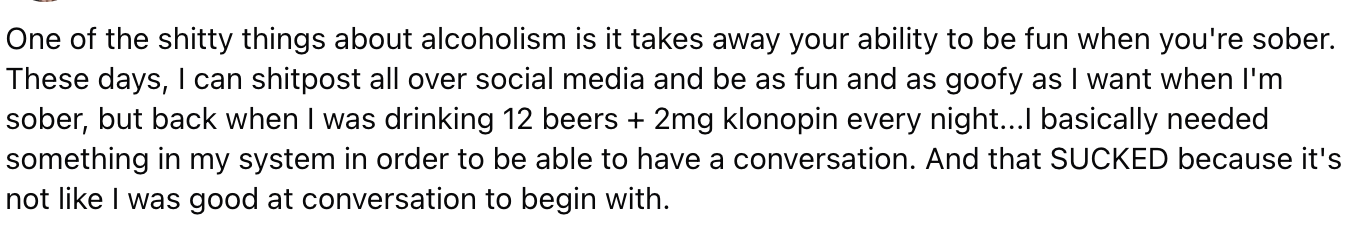 TabulaRasaNot on November 25, 2025 12:02 pm Been sober 12 years and I STILL haven’t figured out how to be as fun, laid-back, patient and carefree as I was when I was drunk. Oh well, still beats the life I lead when I was in deep.