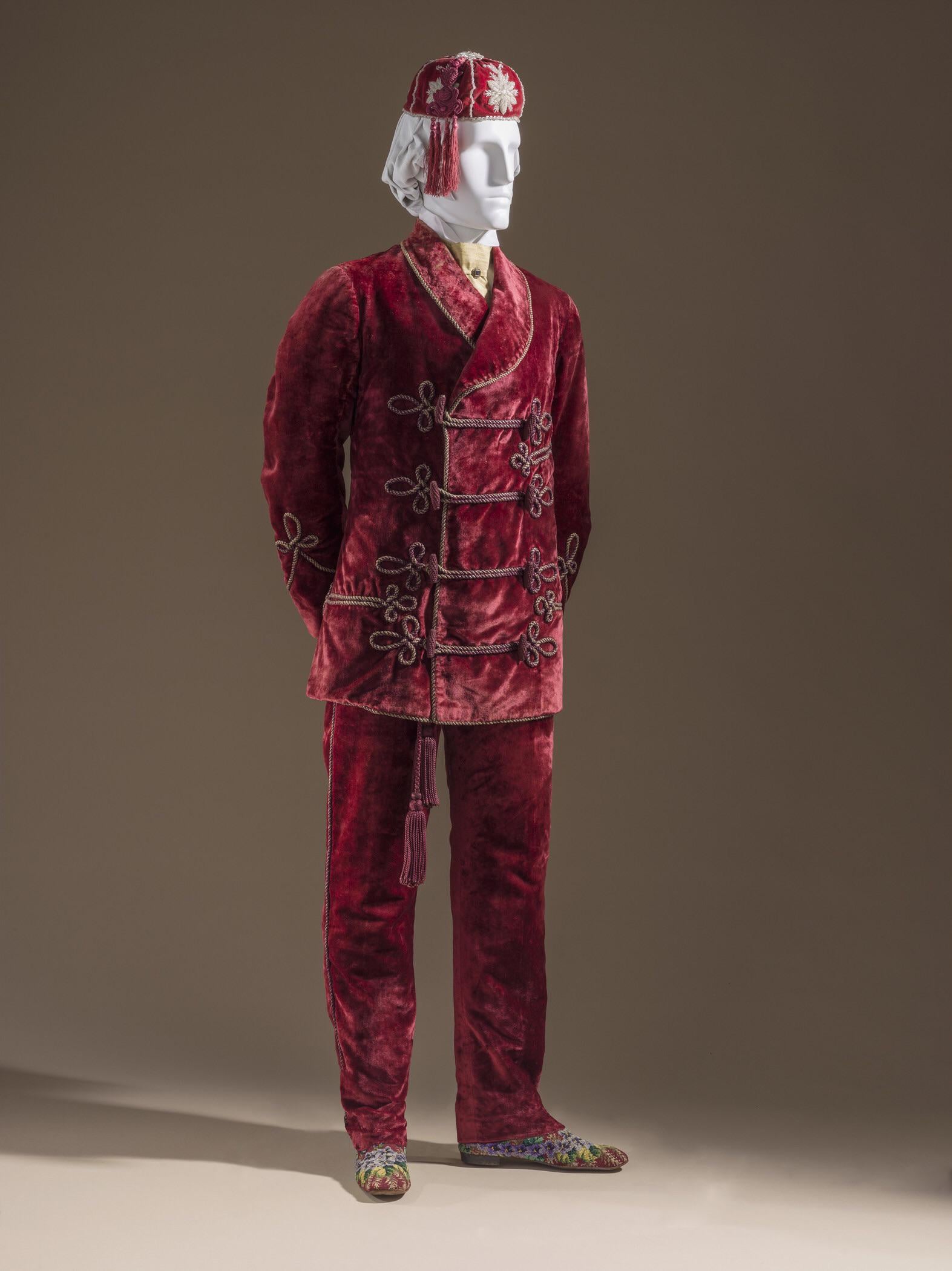 In the 1880s, a smoking [suit](https://collections.lacma.org/node/222900) was a luxurious, informal garment worn by men after formal dinner to protect their formal clothes from smoke and provide comfort. These suits, often featuring smoking jackets were made from velvet or silk, and featured a collar, cuffs, and a button closure. They were often decorated with intricate embroideries and came in a variety of colours, including deep reds, greens, and blues. They were designed for relaxation in private settings like a smoking room or gentlemen’s club. They were frequently associated with rich and exotic fabrics. Smoking suits, jackets, and caps were designed to keep the smell of tobacco, said to be offensive, particularly to the ladies, off the gentleman’s person. As smoking became more widespread, so did the popularity of the smoking suit. It was soon adopted by men of all classes and became a symbol of luxury and sophistication.