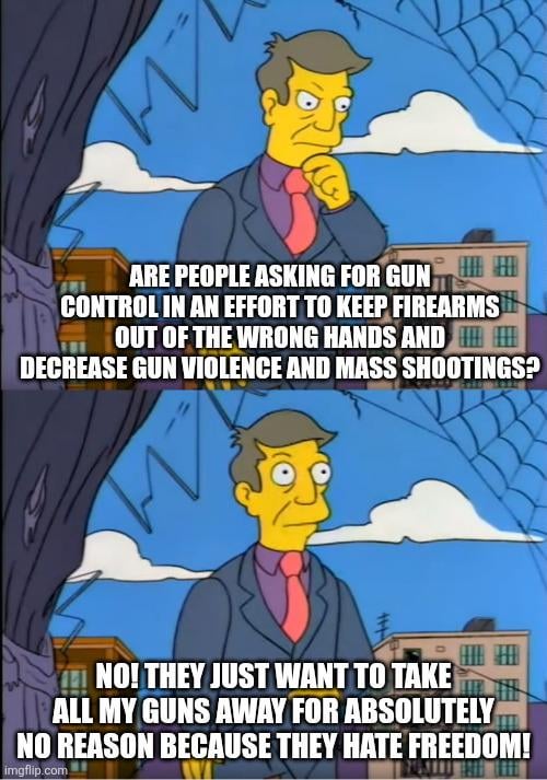 This isn’t an “anti-gun” post, it’s a satirical observation of the victim mentality a lot of pro-gun and 2A absolutists have whenever gun control is mentioned. They refuse to have an honest discussion and instead play victim accusing everyone else of being anti-constitution or wanting to “disarm law abiding citizens”. False. The idea of gun control is to make sure that the people who shouldn’t have guns can’t get guns. There absolutely ARE people who should not have access to firearms and to believe otherwise is insanity and stupidity. “Gun control” means to “control” access of firearms to make sure the wrong people (such as violent criminals, domestic abusers, or mentally ill people) can’t get them. It does NOT mean “take everyone’s gun away”, but gun worshippers refuse to acknowledge that and instead choose to argue extremes.
