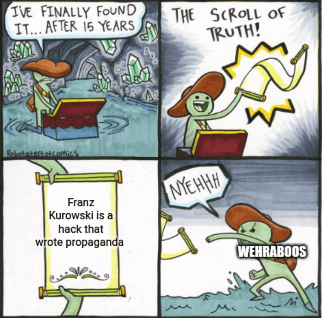 With his work on Panzer Aces he would repeatedly make unsubstantiated claims on German tanker performance. Such as when retelling the battle of Kursk he denied a famous moment of Soviet courage. See during the battle a Soviet t34 managed destroy a German Tiger by ramming it with his combusting tank. Franz would insist that the Tiger was perfectly fine and managed to blow up 5 more Soviet tanks before retreating