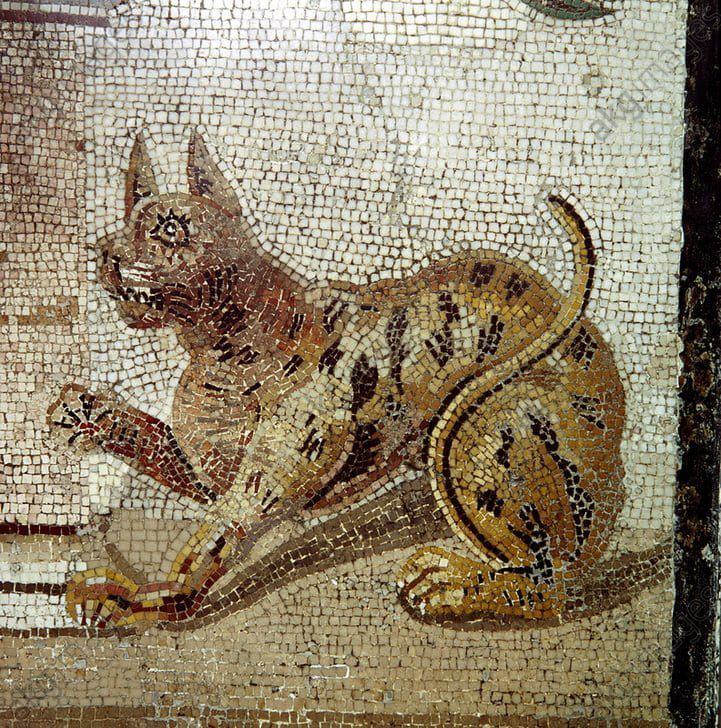 Detail from Roman mosaic showing a cat, Pompeii. [721×728]