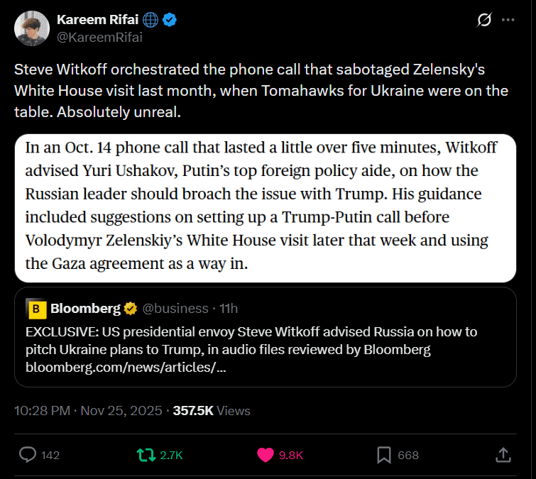 LuckyandBrownie on November 26, 2025 7:42 am Witkoff has to resign now right? I don’t think trump cares about the call, or working with Russians; but it’s a public embarrassment for trump. Or is trump too far afield to register this as a huge embarrassment for him.