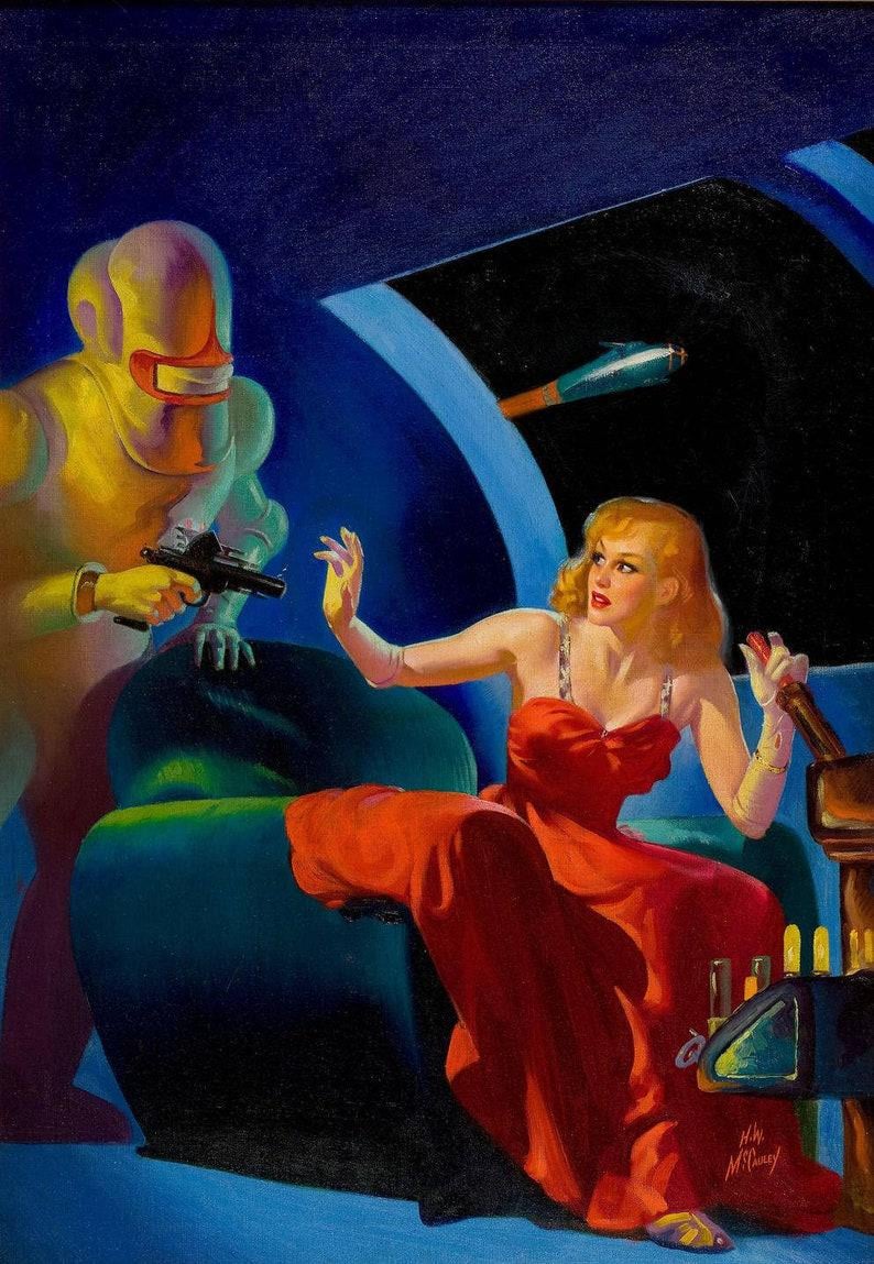 So strange. Is she piloting a spaceship in a formal gown and a comfy chair? What is that device exactly, with its somewhat disturbing stick? A space hooka? A vacuum tube powered breath-a-lyzer? Or maybe she’s drawing a dagger. Confused.