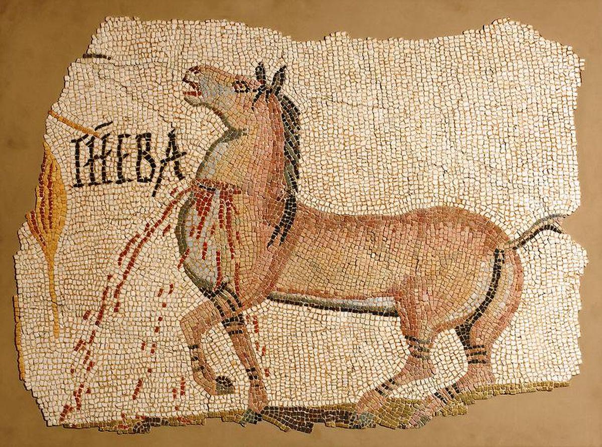 Roman mosaic panel representing a wounded equine. The inscription in Latin “THEBA” may suggest a connection with city Thebes, the name of a horse or a hunter. Dated back to III-IV century CE. [1200×891]