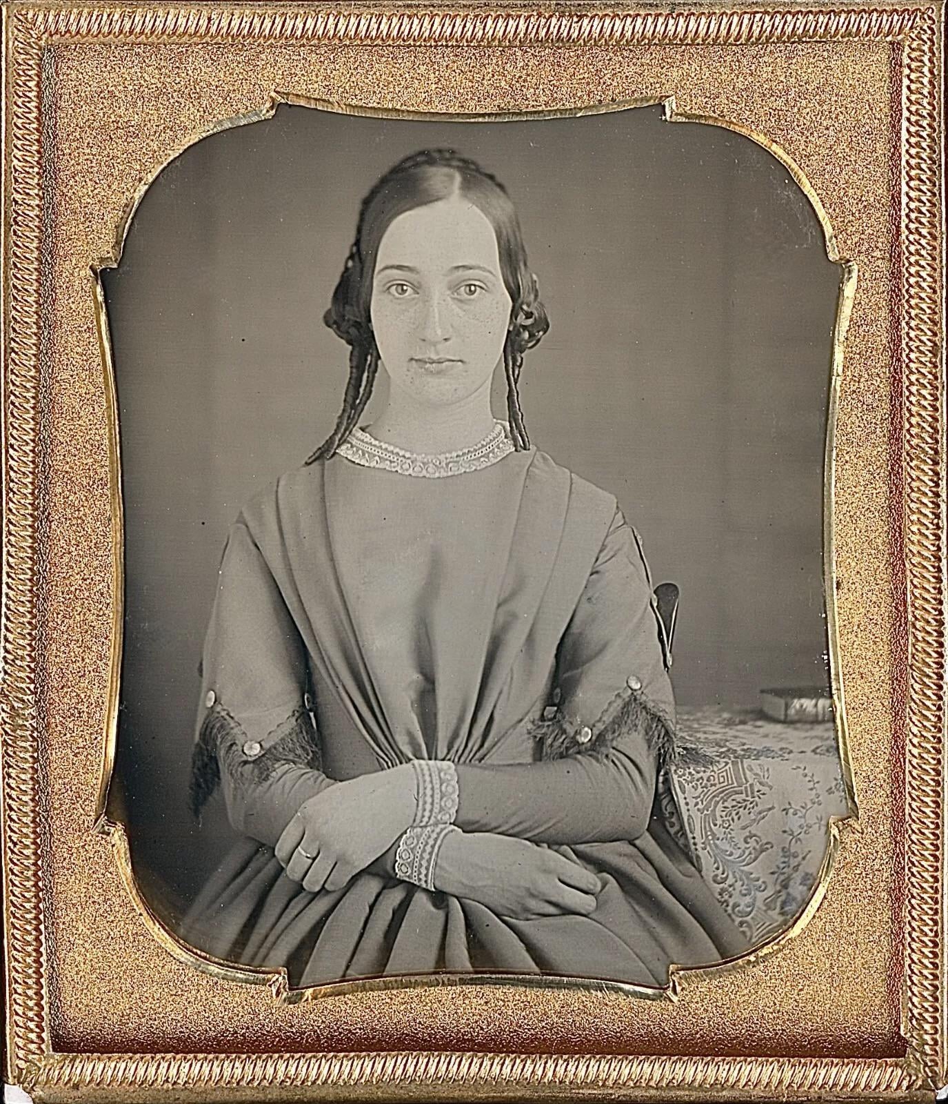 Young freckled lady posing for her portrait (you can see the freckles if you zoom), circa 1850s. daguerreotype