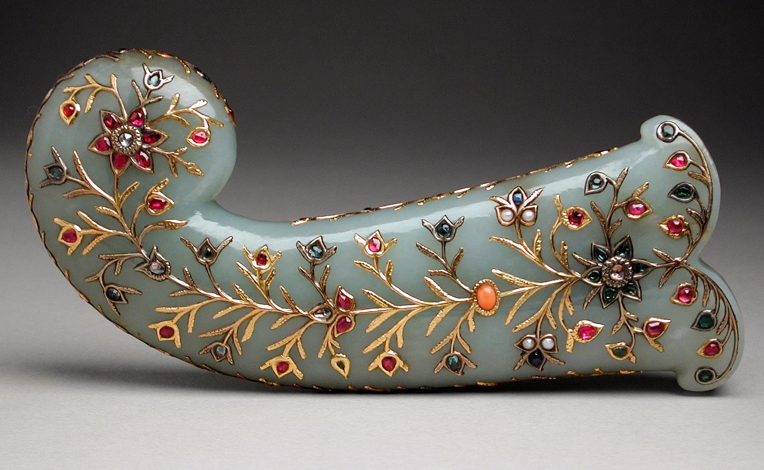 Jade dagger hilt with rubies, emeralds, pearls, coral, spinels, sapphires, and glass set in gold. India, Mughal Empire, 1850 [2600×1600] by MunakataSennin