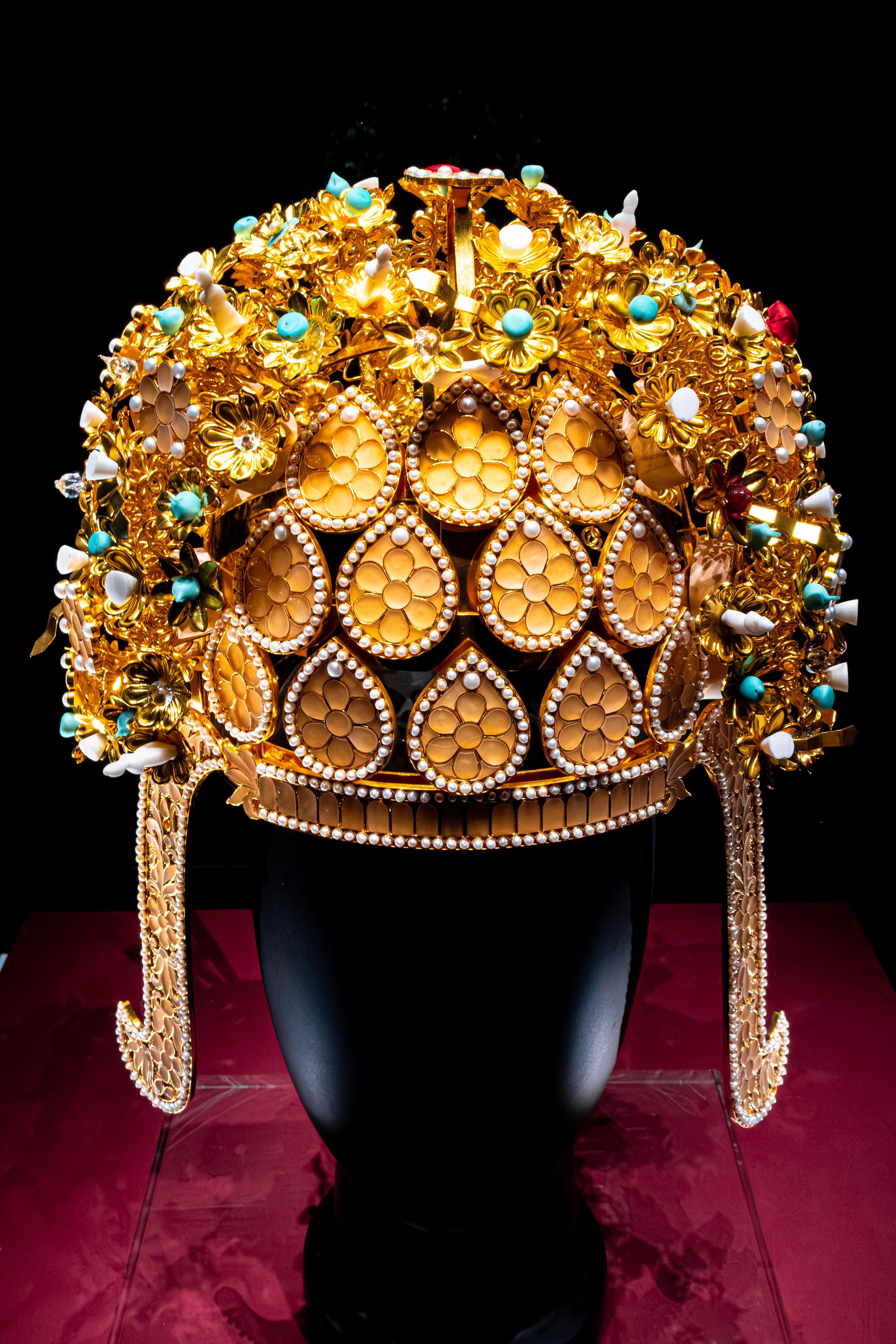 The original crown was unearthed from the tombs of the Emperor and Empress in Yangzhou, Jiangsu Province, in 2013. it was in such a terrible shape that even handling it could crumble it to dust, so it was sent into a lab inside the lump of earth it was in. Testing revealed it was made of various materials including gold, copper, iron, glass, marble, pearl, wood, lacquer, cotton, silk, etc., and was made using different techniques including hammering and shaping, filigree, granulation, gilding, gold-leaf application, chasing and engraving, lacquerwork, etc. Because the crown was so fragile, decisions were made that no more cleaning will be done, instead a replica (the one in the picture) was made to show what it would have looked like.