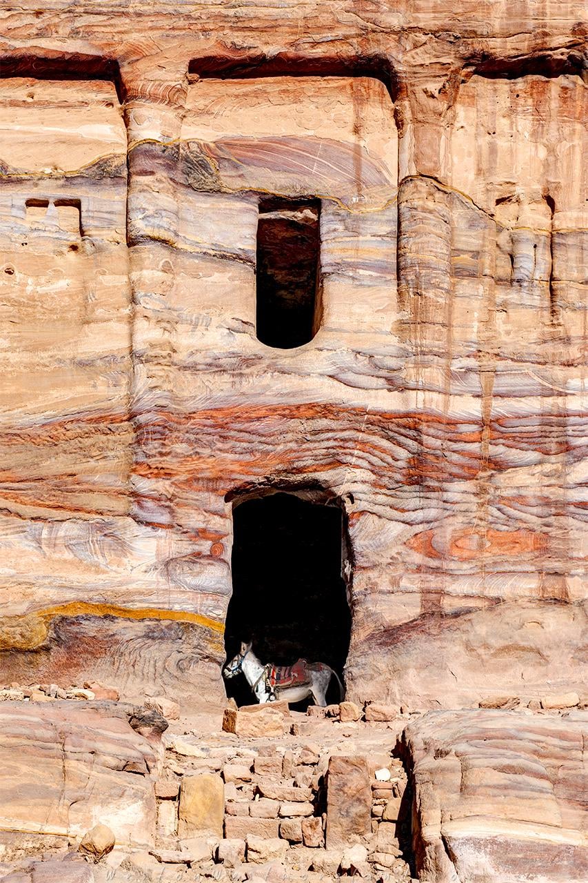 A donkey in a 2k yo Nabatean tomb, any given day, Petra. The capital of the Nabateans, was abandoned and “forgotten” around 900AD. However, the Bedouls, the local Bedouins, have inhabited the caves from the early 19th century… until they got in the path of tourism. Since 1985… [1280×853] [OC]
