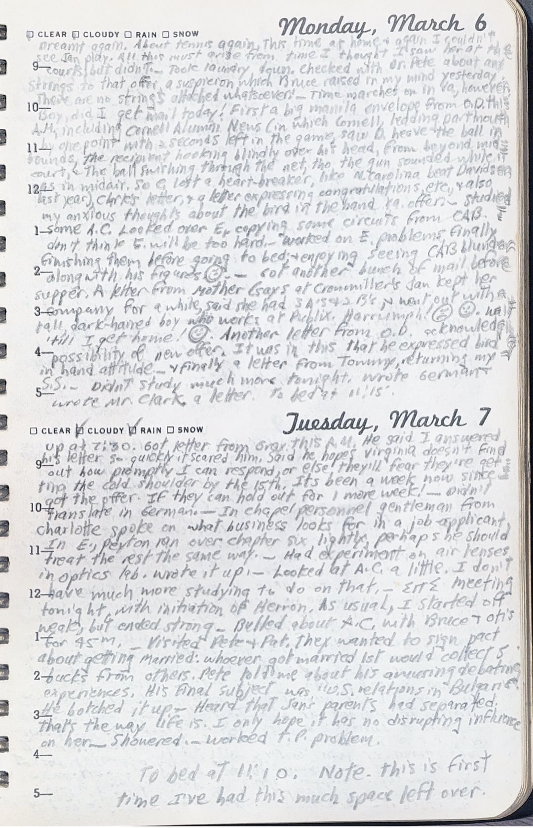 Dreamt again. About tennis again. This time at home and, again, I couldn’t see Jan play. All this must arise from time I thought I saws her at the courts, but didn’t *[Interesting! this is mentioned in William’s* [Jan 31st](https://www.reddit.com/r/TheWayWeWere/comments/1p4sao2/excerpts_from_a_physic_students_extensive_1950/) *Entry]*. Took laundry down. Check with [Dr. Pete](https://imgur.com/a/IjwAQu0) about any strings to that offer, a suspicion which [Bruce ](https://imgur.com/a/54tJg9v)raised in my mind yesterday. There are no strings attached whatsoever! *[Woohoo!]*