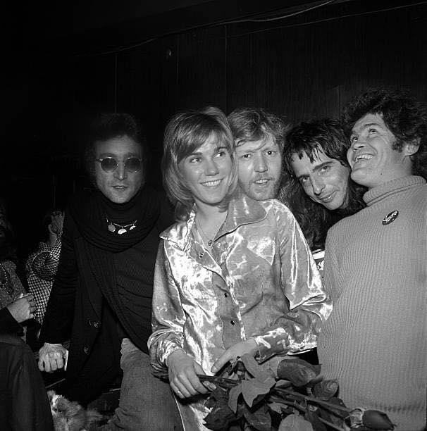 Drinking buddies known as ‘The Hollywood Vampires’ John Lennon -during his ‘Lost Weekend’ period), Harry Nilsson, Alice Cooper and Micky Dolenz celebrate an early Thanksgiving with singer Anne Murray at the Troubadour on November 21, 1973
