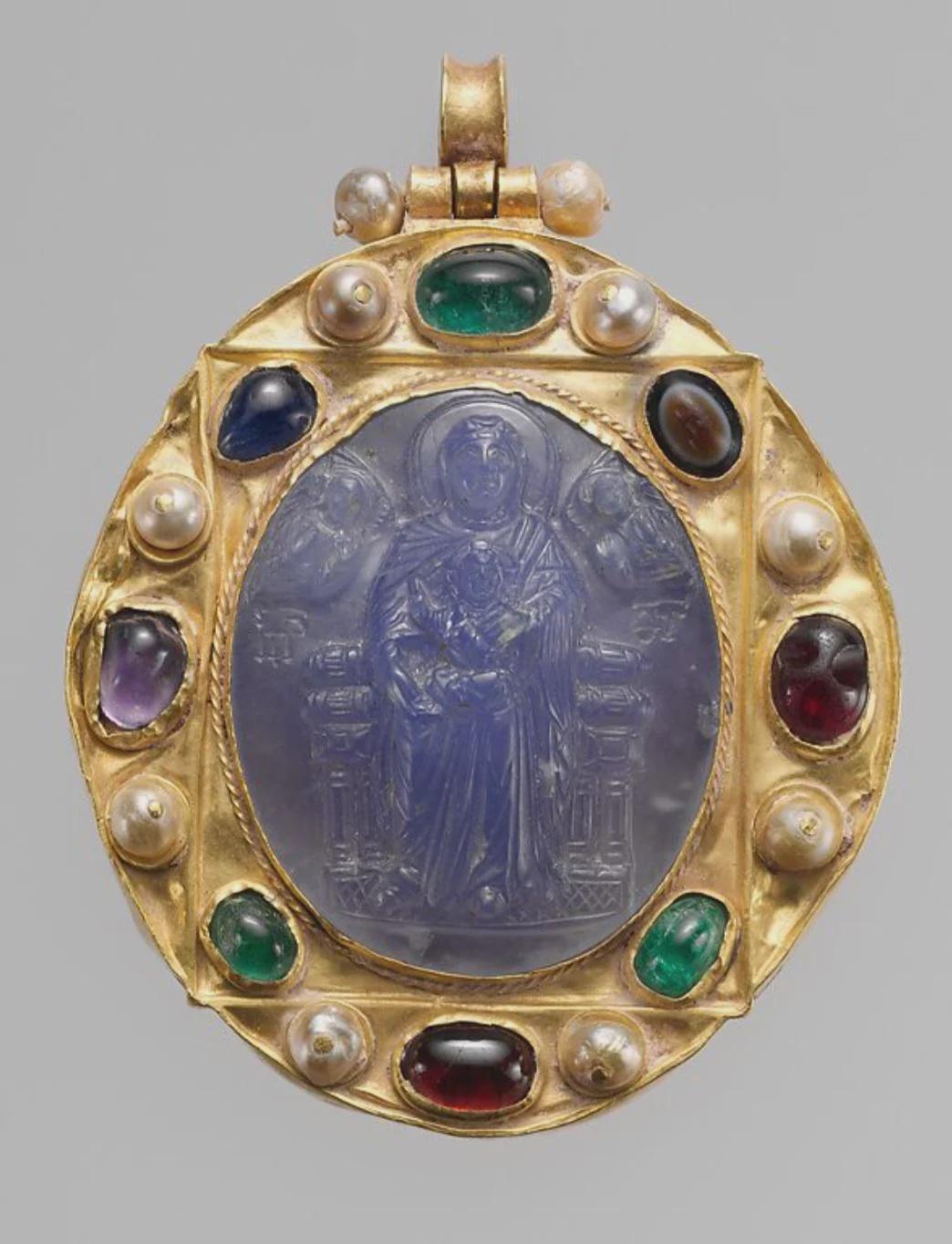 The pendant brooch depicts the Virgin Mary with child Christ flanked by archangels, surrounded by a gold mount decorated with pearls, emeralds, garnets, sapphires, and a sardonyx intaglio. On the backside (which isn’t visible in the photograph), made out of gold, Christ Pantokrator is depicted. The cameo is dated from 1000 – 1100 AD, while the mount from 1100 -1300 AD. This magnificent work of art is an example of Roman (cameo) and Rus (mount) craftsmanship. The object is part of the collection of the Metropolitan Museum of Art in New York.