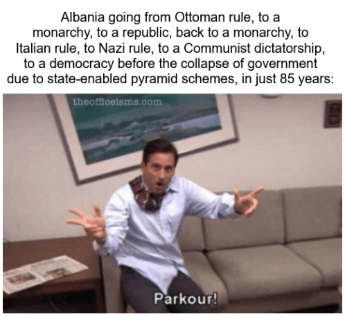 Context: Albania was a part of the Ottoman Empire from the late 15th century until a declaration of independence in 1912. Independence came with no real institutions and tribal/religious divisions, which the Great Powers of Europe sought to solve by installing a German, Prince Wilhelm of Wied, as monarch in 1914. This lasted about 6 months, with internal revolts and the outbreak of War One forcing the royal family to flee. With no monarch, the country quickly fell to Serbian, Greek, Italian and Austro-Hungarian occupation until a unified state was reestablished in 1920. For the first half of the 20s, this state was in perpetual chaos, until Ahmet Zogu was declared president of the republic in 1925. Three years later, Zogu declared himself King Zog I, establishing a new monarchy which ruled until the Italian invasion in 1939. Italy controlled Albania until the collapse of the Fascist regime in 1943, at which point the Nazis stepped in to administer a brutal occupation which spawned multiple resistance movements. There was now a combined resistance movement and civil war, with each faction aiming both to drive out the Nazis and seize power for themselves. By late 1944 the Nazis were forced to abandon Albania and the Communist faction emerged victorious in the civil war, crushing opposition before forming a single-party Communist state in 1946. This increasingly isolationist, brutally repressive and ideologically unyielding regime ruled Albania for 45 years, first falling out with Yugoslavia for not being Communist enough, then falling out with the USSR for denouncing Stalinism, then falling out with the Chinese after Dengist reforms. From 1978 onwards, Albania was alone, with no allies, run by an increasingly paranoid Enver Hoxha who kept the borders sealed, banned any outside culture, and poured a huge amount of money into constructing hundreds of thousands of concrete bunkers and pill-boxes for a war with Yugoslavia that was never coming. Hoxha died in 1985, and his successor Ramiz Alia tried to very cautiously liberalise, until the regime kind of gradually wound down and eventually elections were held in 1991. With that, democracy was back, but with little stability and rampant corruption. Albania was capitalist now, and 45 years of hardline Stalinist policy meant that there were essentially no checks and balances on financial institutions in place. In came the investment firms, which offered wild returns on investments to an economically illiterate populace desperate for income. What people didn’t realise is that these firms weren’t genuine businesses, but were simply Ponzi schemes paying old investors with the new investors’ money. By early 1997, some firms were no longer able to pay out, and the schemes quickly collapsed wiping out over half of Albania’s GDP in a matter of weeks. What began as protests against the government snowballed into an uprising, the government lost control of most of the country, and the army fractured with armed groups ruling most cities. Thousands died, tens of thousands left the country, and a UN mission had to be formed to enter Albania, restore order, and hold new elections.