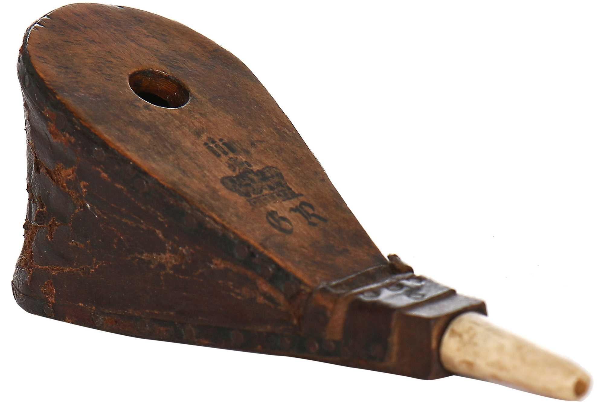 A wig-powder bellows bearing the cypher of King George III, circa 1775. A wig-powder bellows was a handheld tool used to apply powder to a wig or hair in the 18th century. It worked by pressing the bellows together to force a cloud of powder, typically made from scented starch. [2000 x 1333]