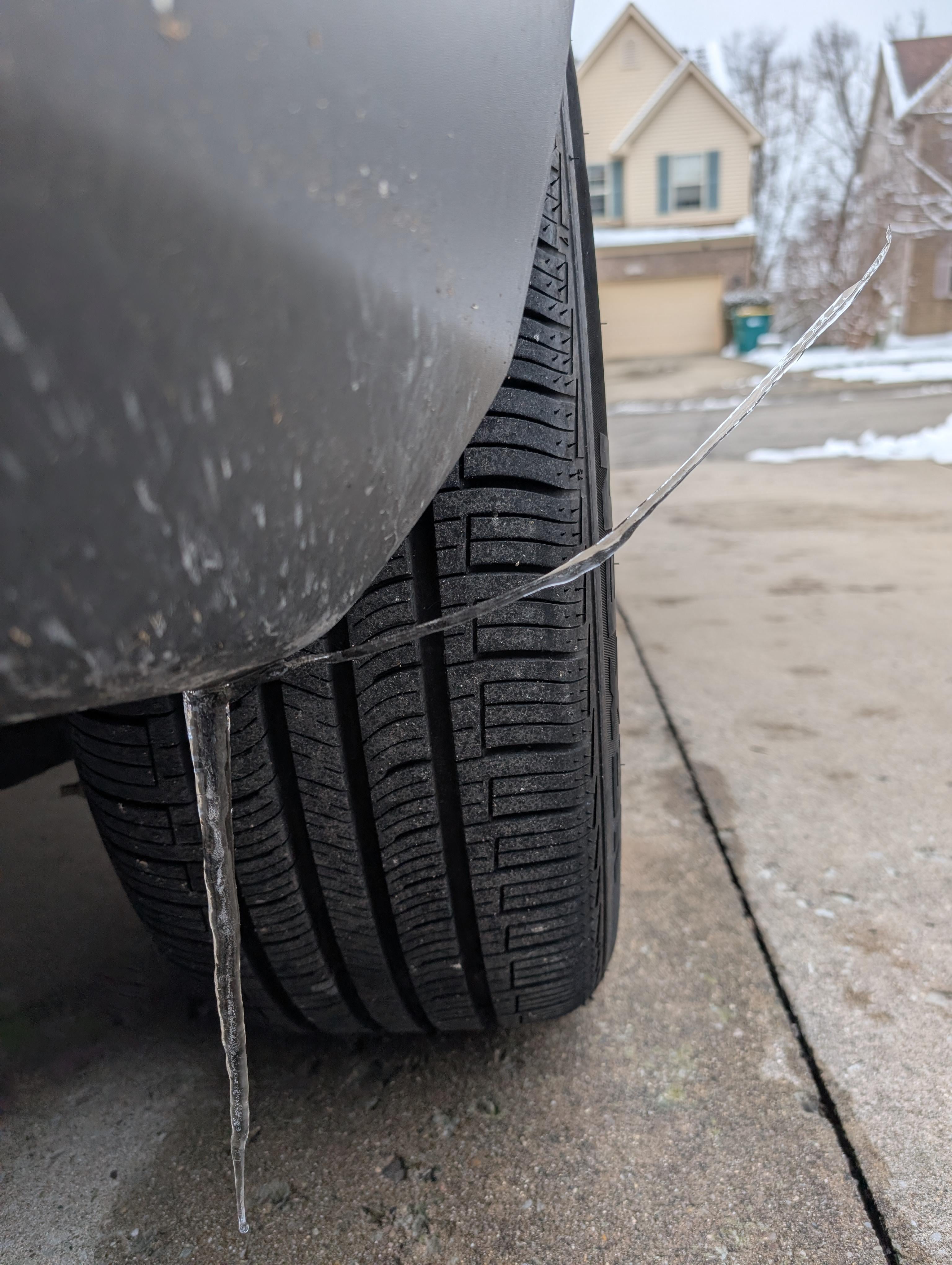 You can see how it follows the same arch as the lip of your rear quarter, it became detached and angled away from the truck. Not sure how this isnt the obvious conclusion vs gravity defying ice.