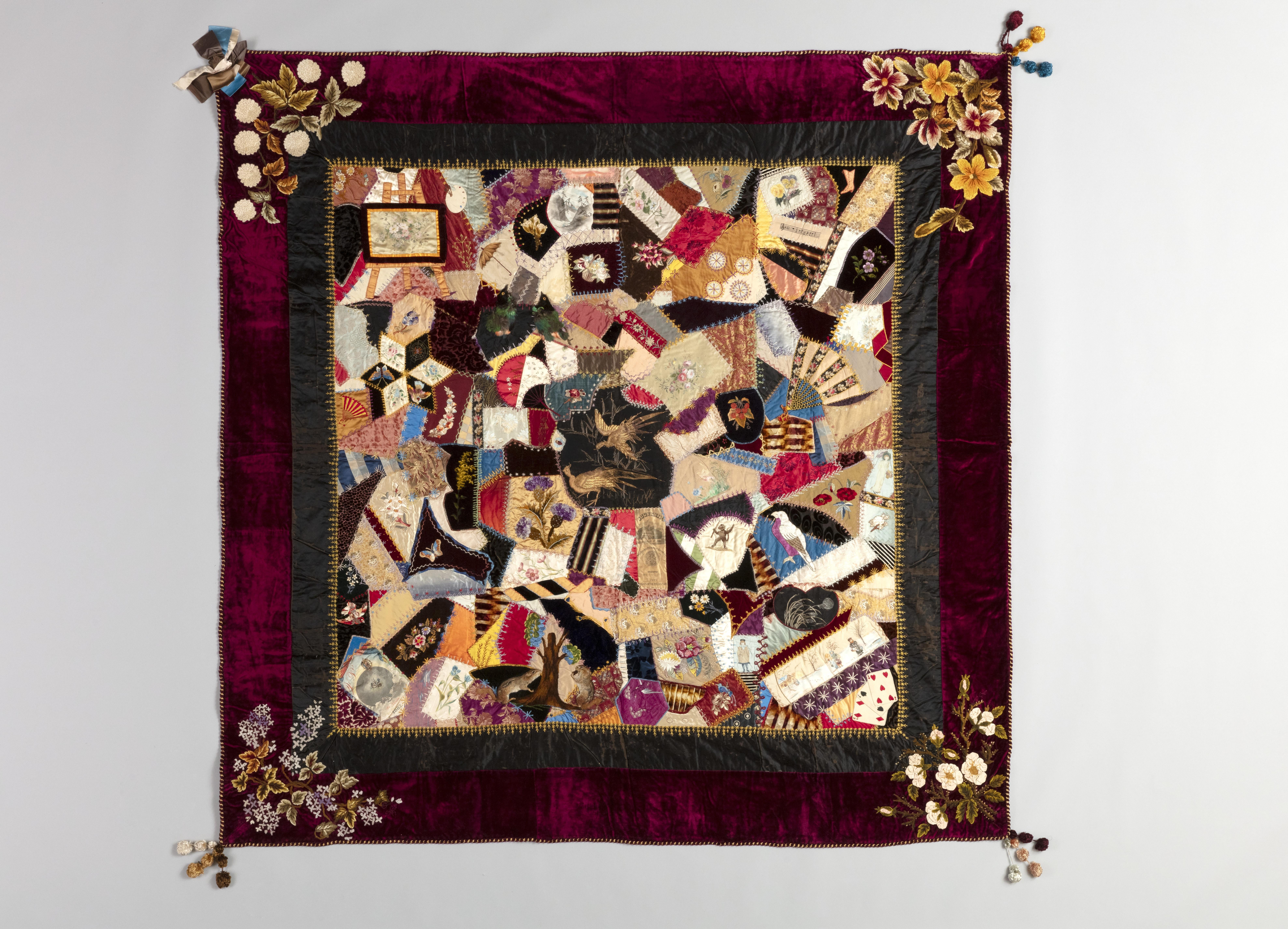 Crazy quilt made mainly of silk and velvet featuring a variety of imagery and objects including two stuffed chipmunks and two stuffed birds, American, c. 1884. [7910×5704]
