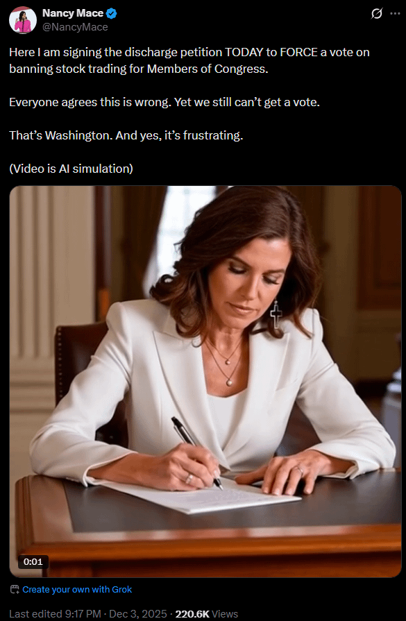 EDIT: Thanks for the downvotes, but I would’ve expected people to appreciate that while the image is dumb as hell, at least she’s signing on to force the vote on the bill related to congressional shareholding. Something a vast majority of Americans support.
