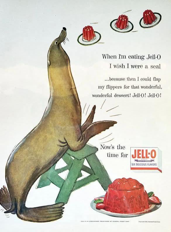 When I’m eating Jell-O I wish I were a seal …because then I could flap my flippers for that wonderful, wonderful dessert! Jell-O! Jell-O! (1954)