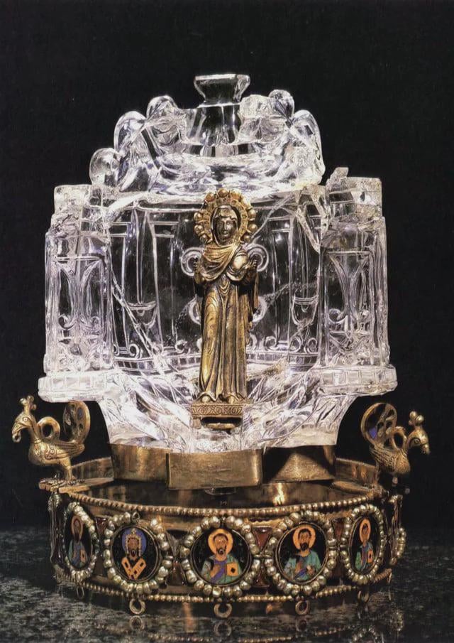 Made sometime during the late 9th or the early 10th century AD, it is an example of exquisite Roman craftsmanship, using gold, gilded silver and pearls. The base of the crown includes medallions, originally 14 in number, which depict the Apostles, Christ, and Emperor Leo himself, while the sides of the base feature two peacocks with spread tails, that were added much later. The crown’s main unique feature is a single carved piece of mountain crystal that includes a small golden statue of the Virgin Mary. The artifact was plundered during the Fourth Crusade and is currently housed in the Treasury of San Marco in Venice.