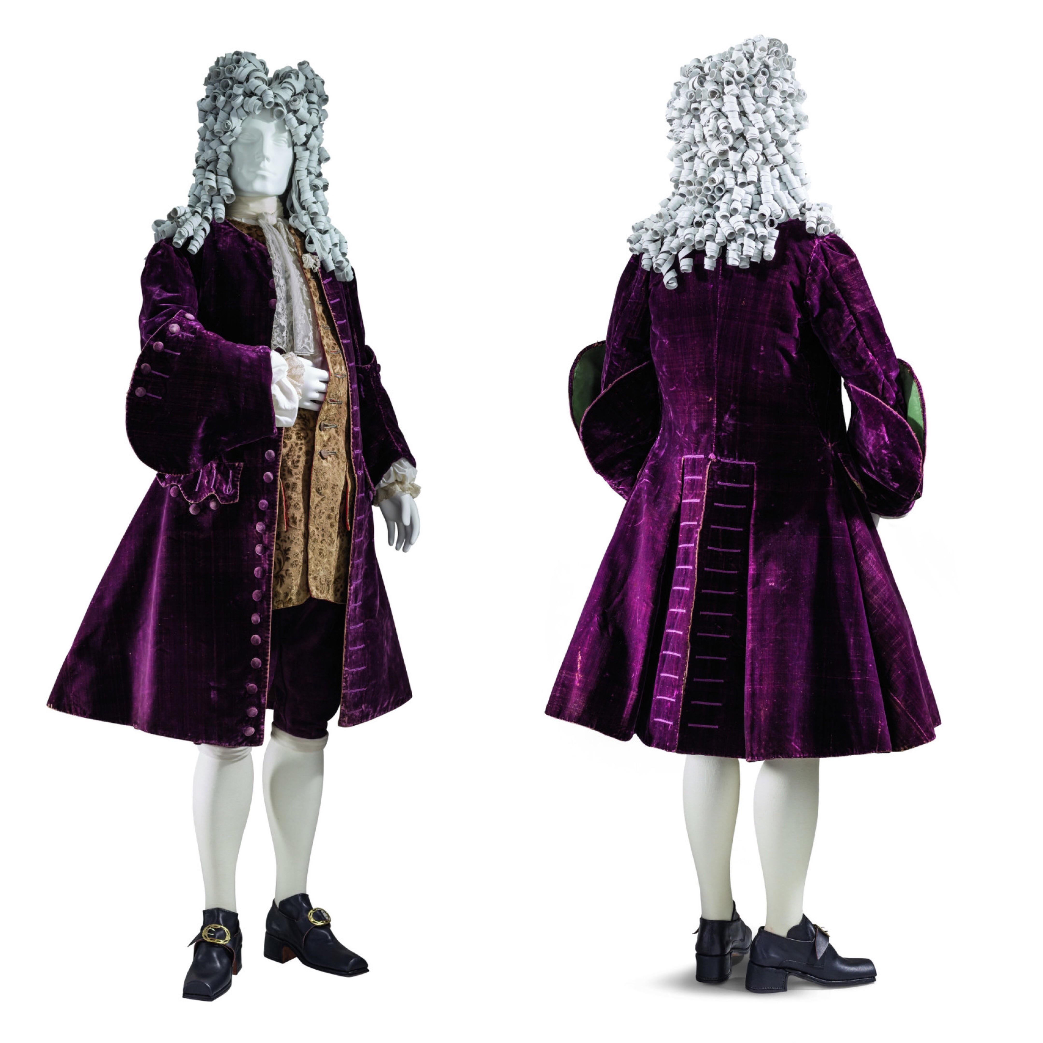 1. This a collarless coat with a full skirt stiffened with interlining and matching or contrasting waistcoat fastened down the center front. The coat that required expert tailoring for its cut and fit “was the focal point of attention through the luxury and disposition of fabric and trimming… in the form of braid, embroidery, or lace”. From the mid-1720s to about 1750, “the most characteristic cuff was a closed cuff, keeping to the width of the sleeve, but coming almost up to the elbow” and known in England as a ‘boot sleeve’. In the first half of the century, many waistcoats had long sleeves. Under the long skirts of the coat and waistcoat, the full-cut fly-front breeches were barely visible.