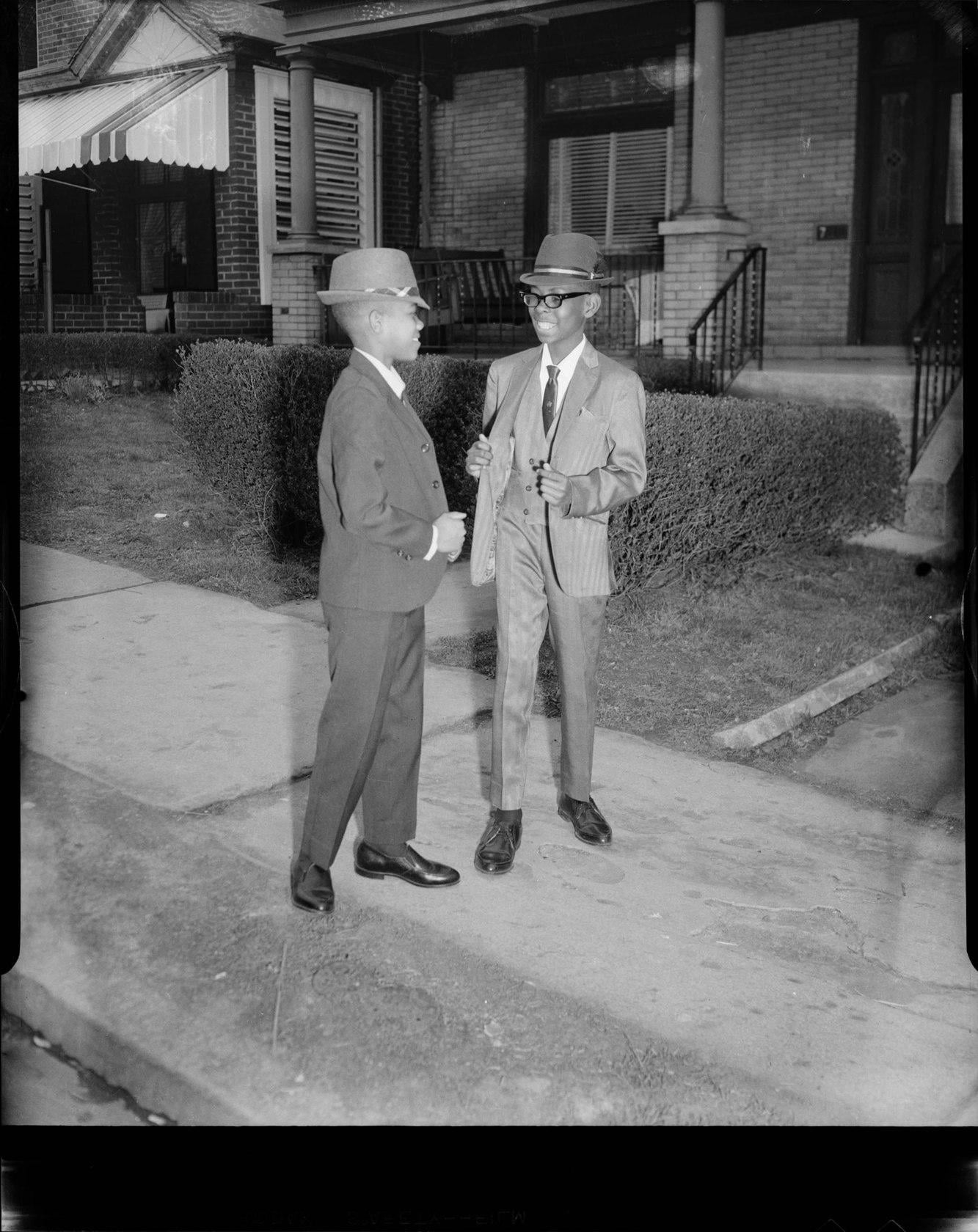 Two boys smile as they compare suits. Pittsburgh, 1960.