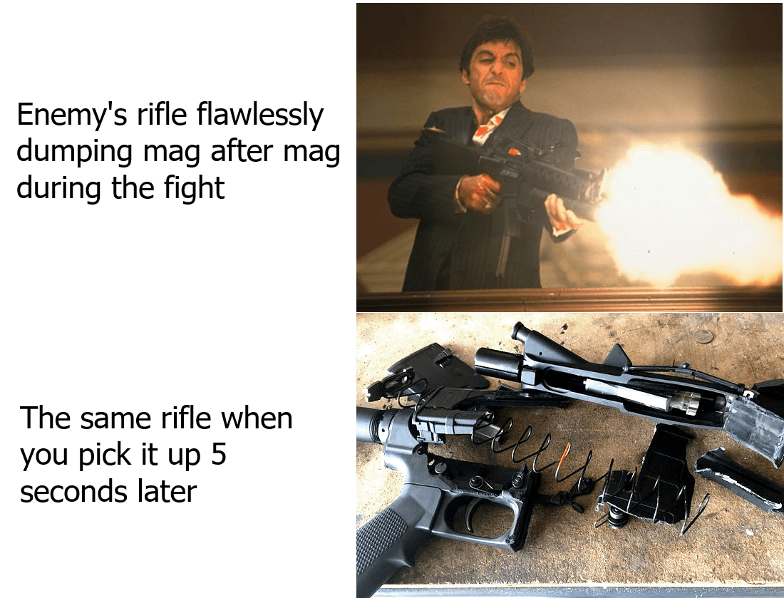 I absolutely despise most condition systems. Guns are durable, a *piece* might break and force repairs after several dozen magazines but more often it can be remedied once you have a chance to look at it out of combat. It’s ‘realism’ but it’s unrealistic.