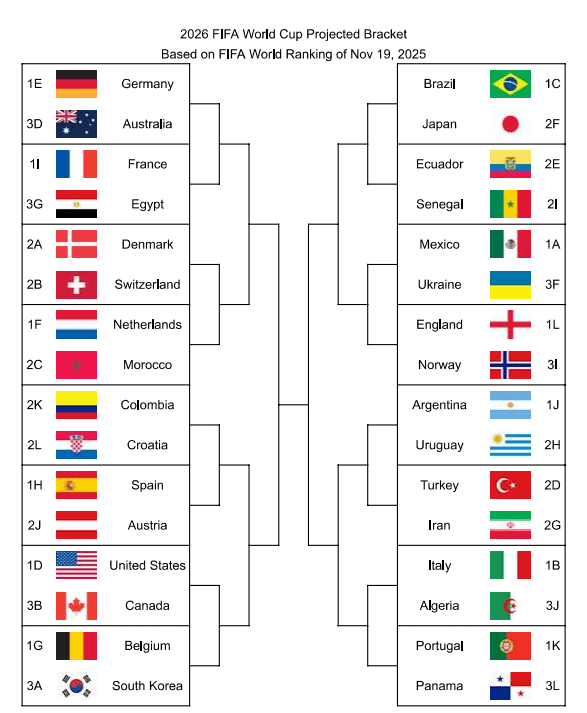 This bracket is an unofficial projection of the 2026 FIFA World Cup knockout stage, generated entirely from FIFA ranking positions. Higher-ranked teams are assumed to finish higher in their groups, win playoff paths, and advance through the knockout rounds.