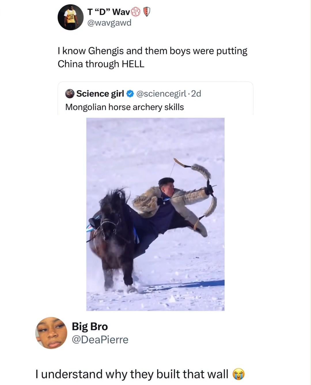 A group of friends and I somehow got on the topic of the Great Wall and one of us asked how long it took to build. We looked it up and it took 2000 years. And my buddy goes how come none of those emperors were just like “That’s fine. It’s not like Genghis Khan is still alive impregnating our women anymore”. And my friend who’s Chinese just said “Generational trauma.”