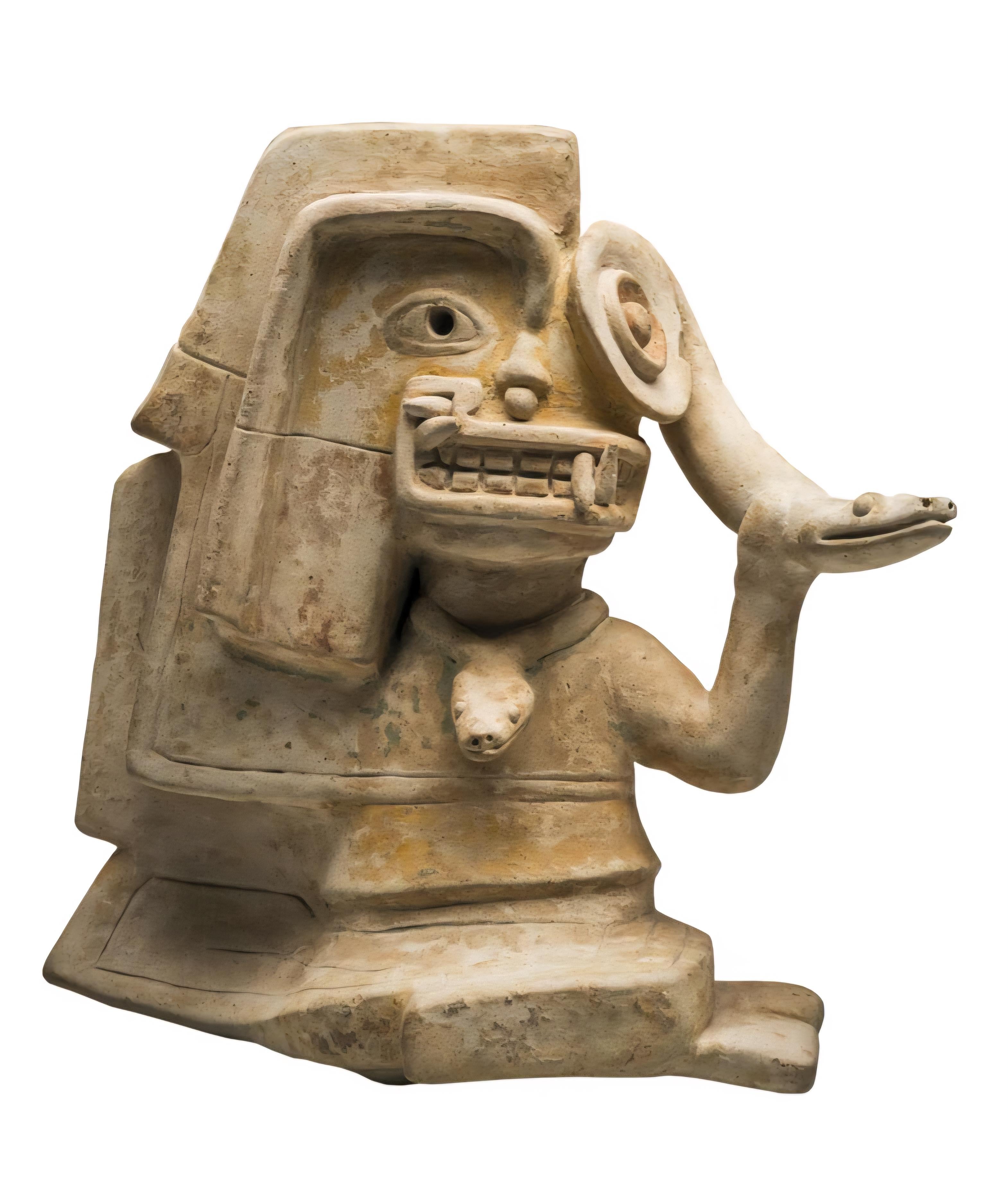 Picasso Tolita is a ceramic sculpture, made by Tumaco-La Tolita culture (350 BCE-400 CE) in Ecuador, that depicts an anthropomorphic figure with several zoomorphic elements, including feline fangs, a necklace that transforms into a snake, and a snake emerging from its left eye [3140×3688]