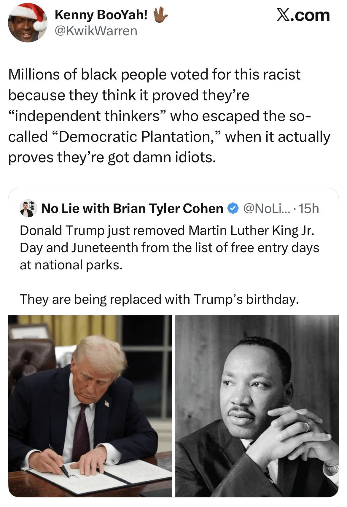 Imagine being non white and voting for Donald Trump only to see what all racist and stupid shit he is doing now. I would wait for the yo I made a mistake but most are going to double down they made the right choice instead of saying I fucked up.
