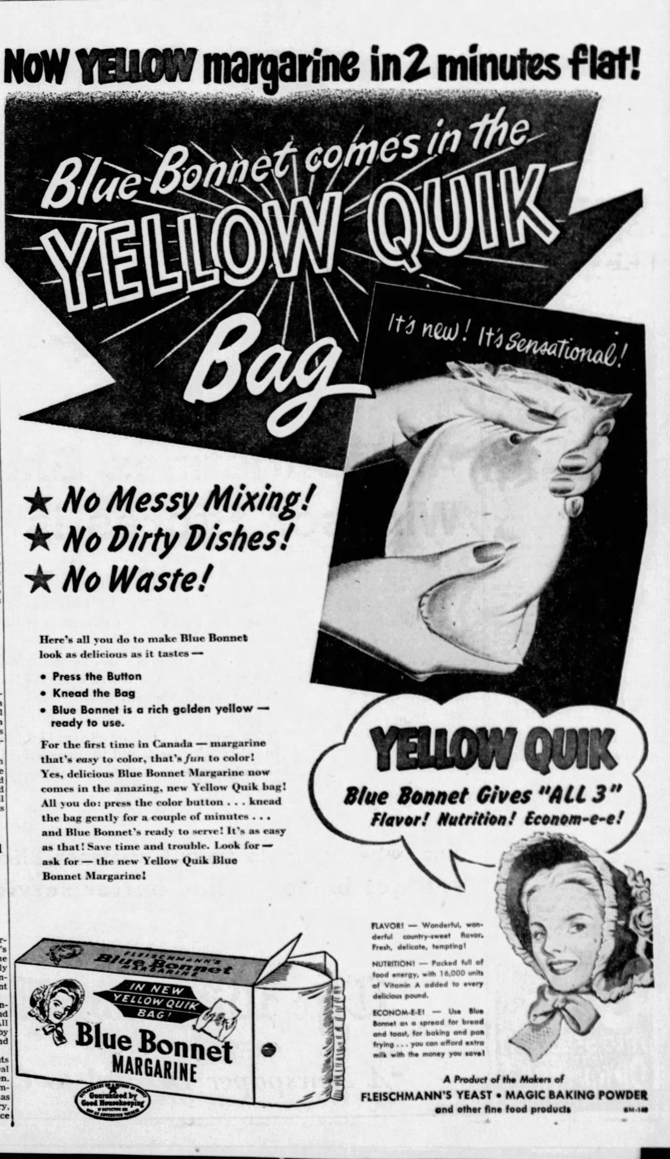 YELLOW margarine in 2 minutes flat! Blue Bonnet Margarine (1949)