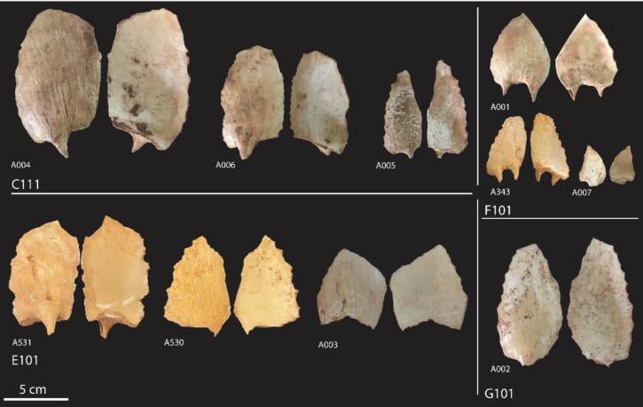 From Boodie Cave on Barrow Island off NW coast of Western Australia. Made from Melo amphora they are examples of the longest lived shell tool tradition in the world – 46,000 years to the recent past.