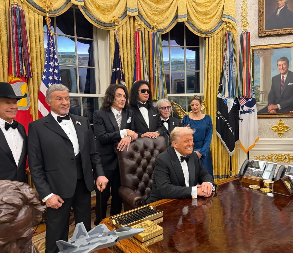 1. Beside Stallone and the guy from Kiss(?), who are these people – including the woman who is questioning her life choices?