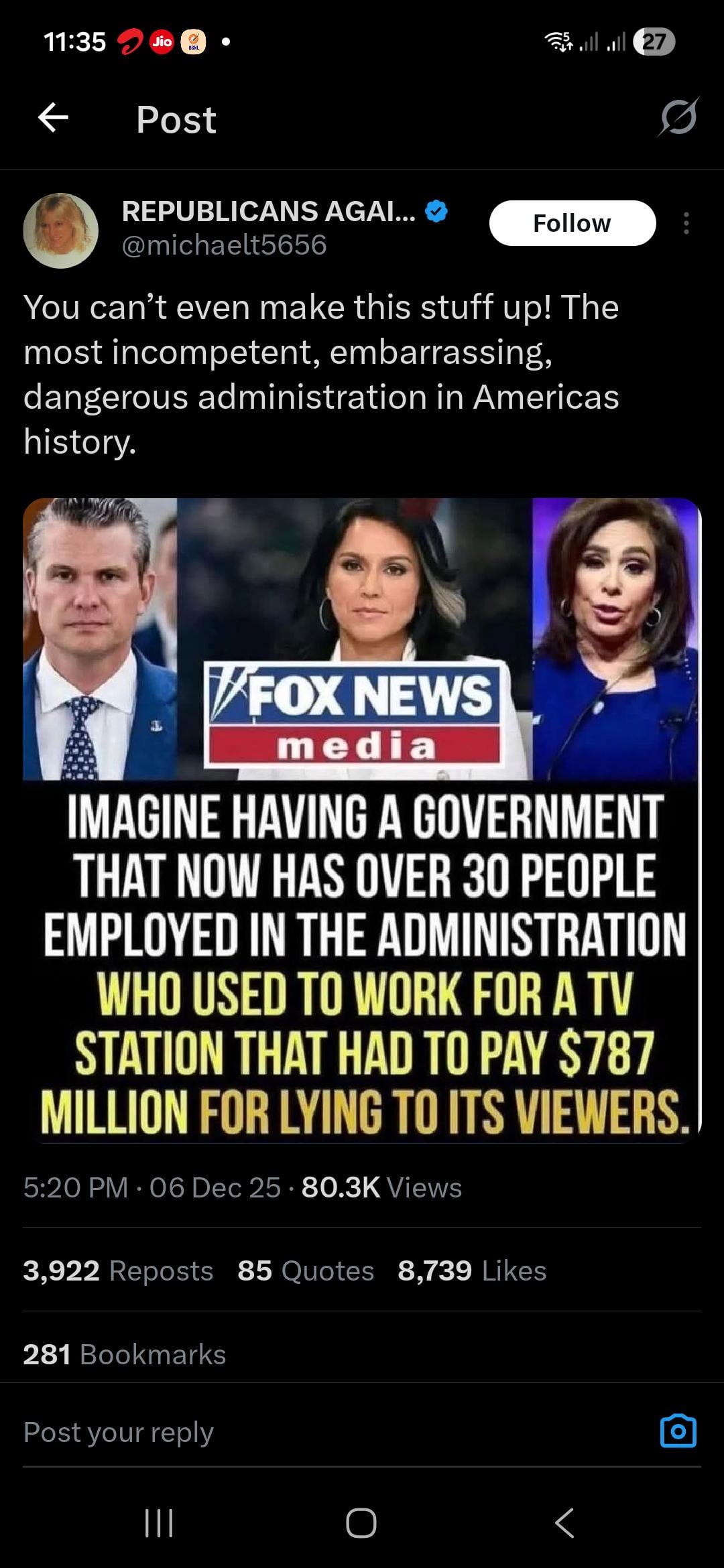 $787 million AND had to admit they weren’t a “news”network but an “entertainment” network. I dunno, I guess racist, ignorant old white people need entertainment too while they sit on their fat asses calling for their sister wives to help flip them over so they don’t get sores.