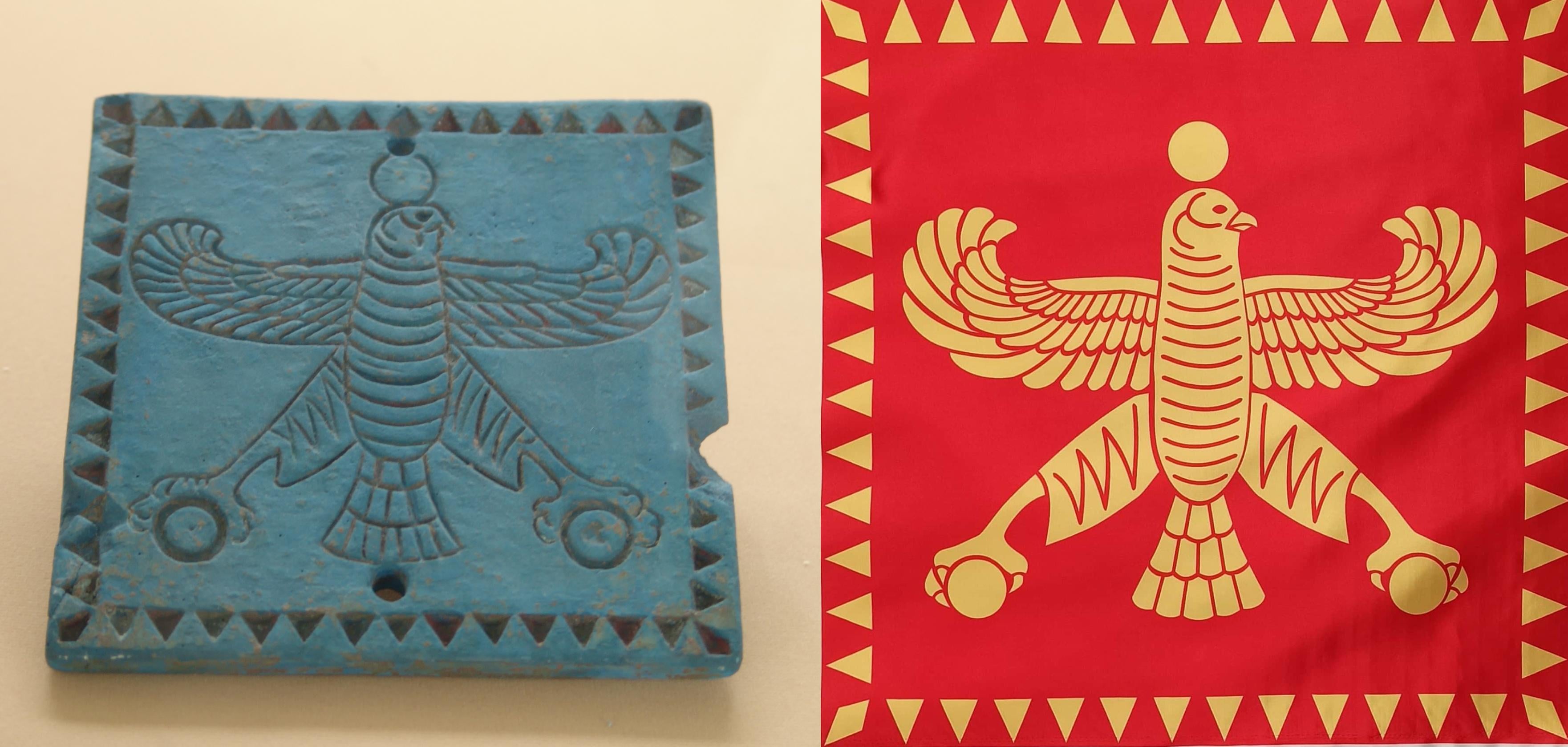 The bird motif is based on the image of Horus, one of the ancient Egyptian deities. Despite all the Egyptian influence, the design still conveys an Iranian concept, depicting a [Shahbaz ](https://en.wikipedia.org/wiki/Shahbaz)(royal falcon). The two holes at the top and bottom of the tile suggest that the plaque was served as a type of flag or emblem.