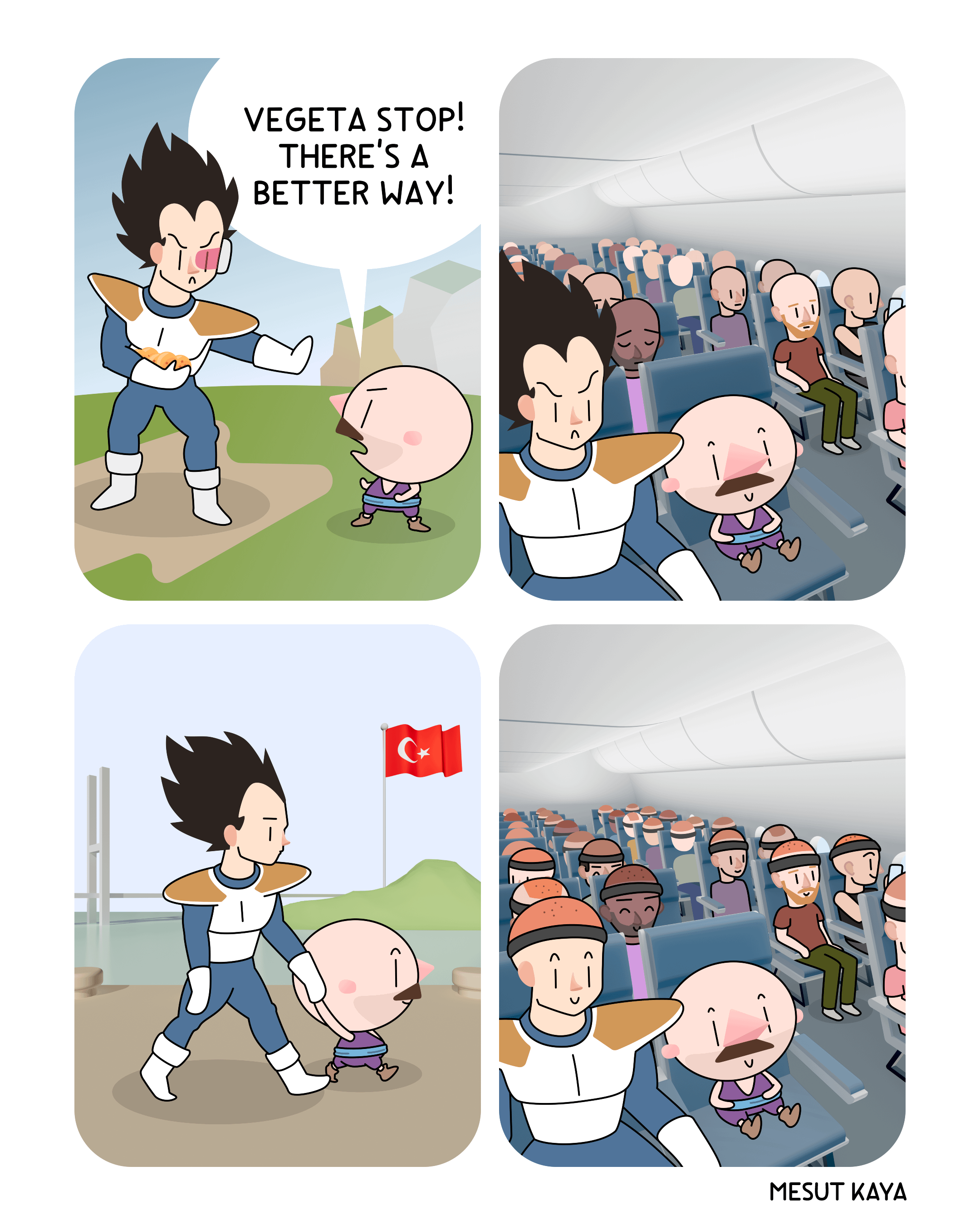 For anyone not getting the joke: Vegeta has a famously big widows peak which is generally a sign of hair loss. He enters the series as an inexplicably angry dude wanting to destroy everything. The joke is that hes just mad about balding, and a trip to Turkiye (famous for hair transplant surgery) is the cure for his anger. The last frame is a plane full of guys after getting hair transplants.