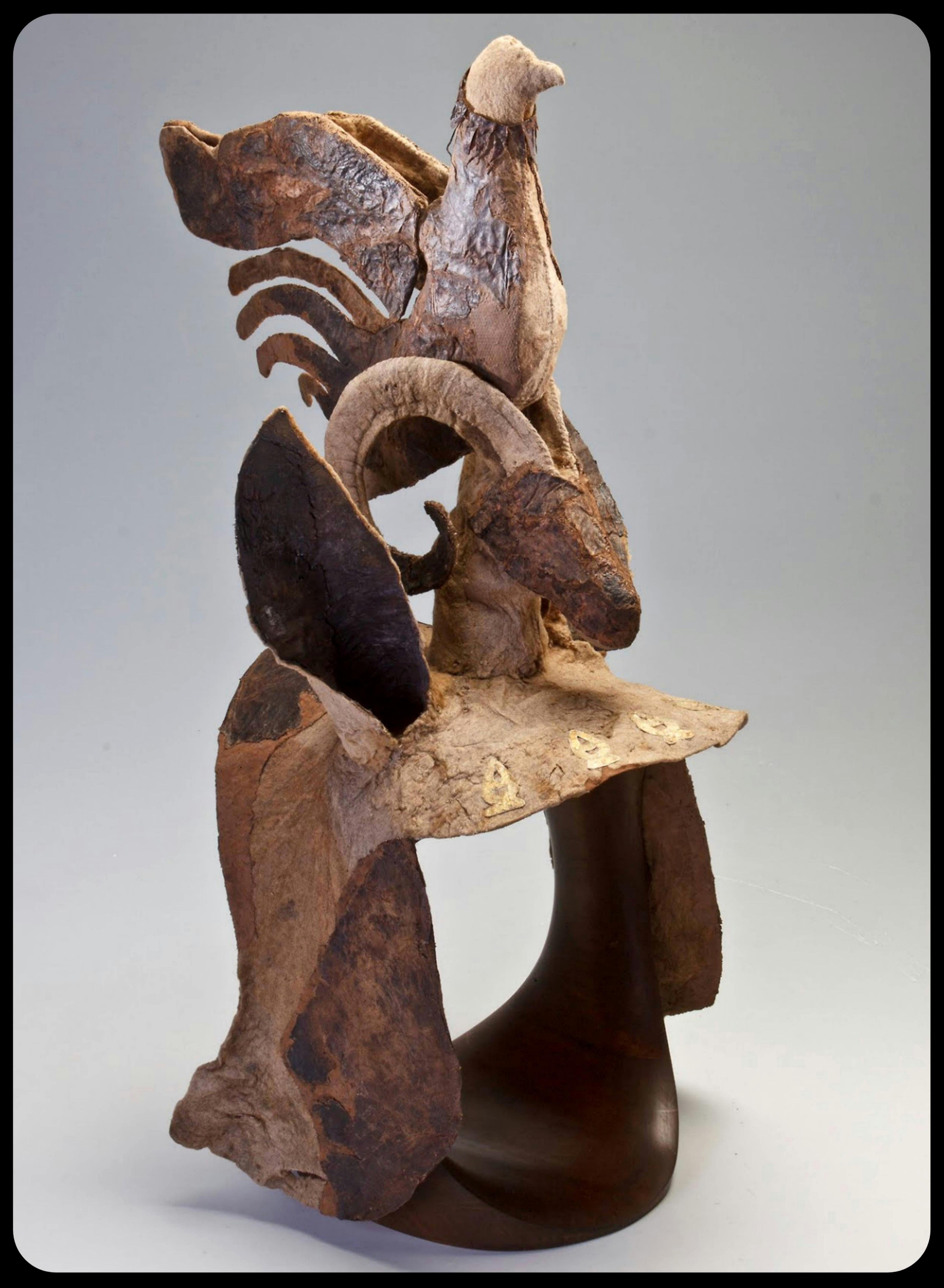 > The headdress is sewn from felt and leather, and topped with a ram’s head with a rooster-like bird standing between its horns. The bird is detachable, its legs are made of whittled sticks, and its wings were made separately on a rod frame. The peak of the mask is decorated with seven fish made of gold foil.