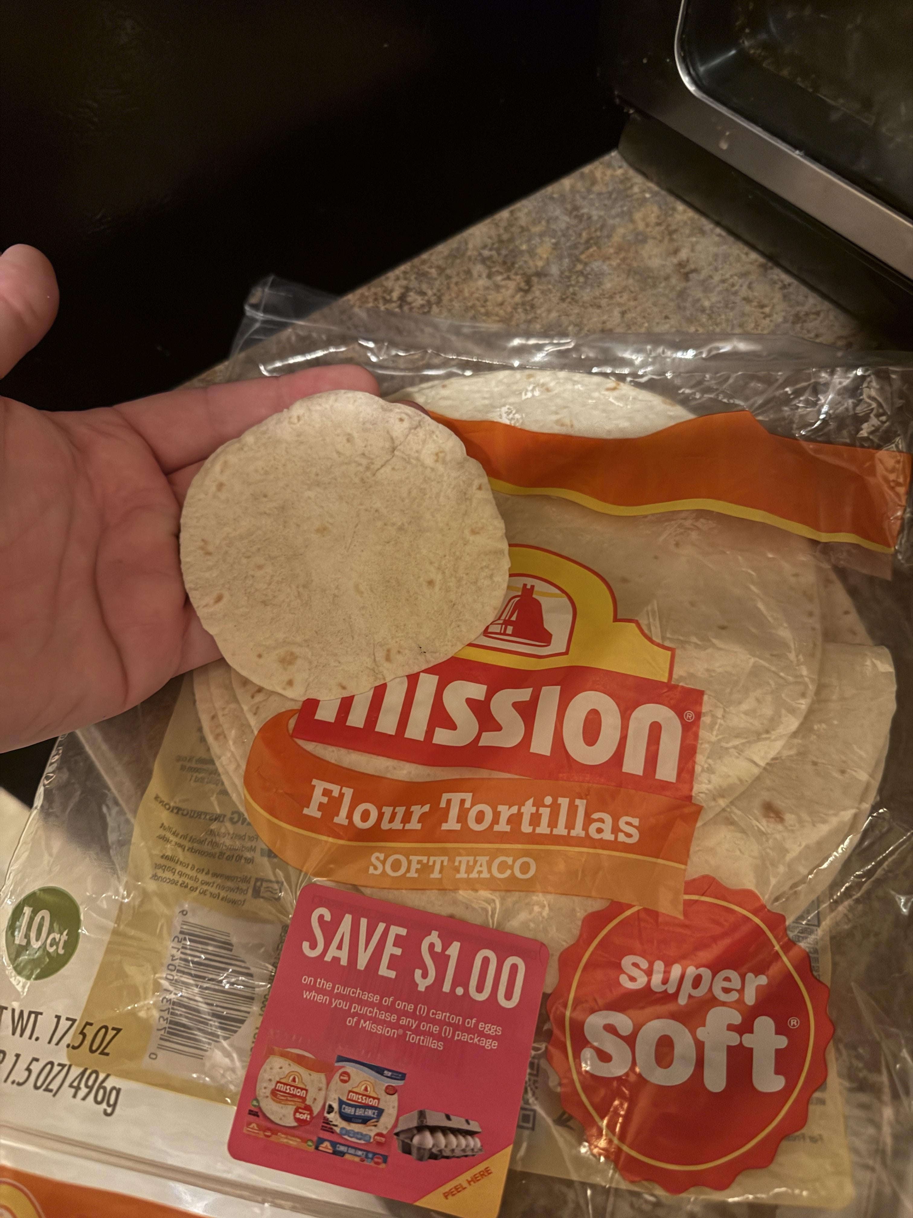 2. Tbh though, the quality of tortillas from mission has been kinda crap for a while now. There’s small tortillas in the large tortilla bags and weirdly shaped ones too. I’ve also had plenty that had holes in them.